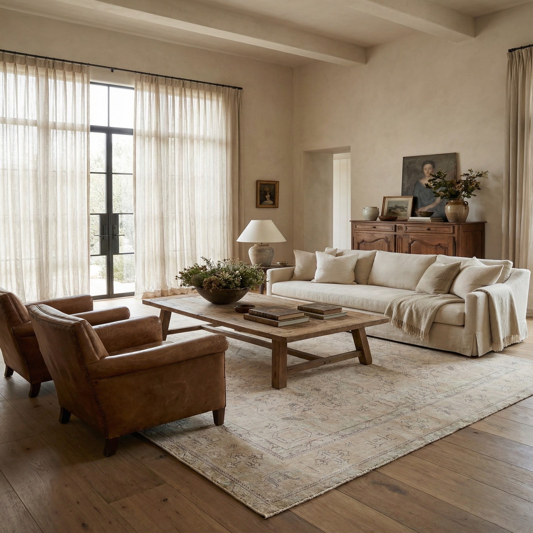 Part of the Ultra Vintage collection, this hand-knotted 10x13 rug is crafted from 100% wool, offering longevity and a plush feel underfoot. The rug presents a traditional design with a central medallion framed by intricate botanical motifs, all set against a soothing beige background that provides a versatile base for various color schemes. Accent colors include tasteful hues of black, brown, green, ivory, and additional beige tones that create a harmonious and refined palette.