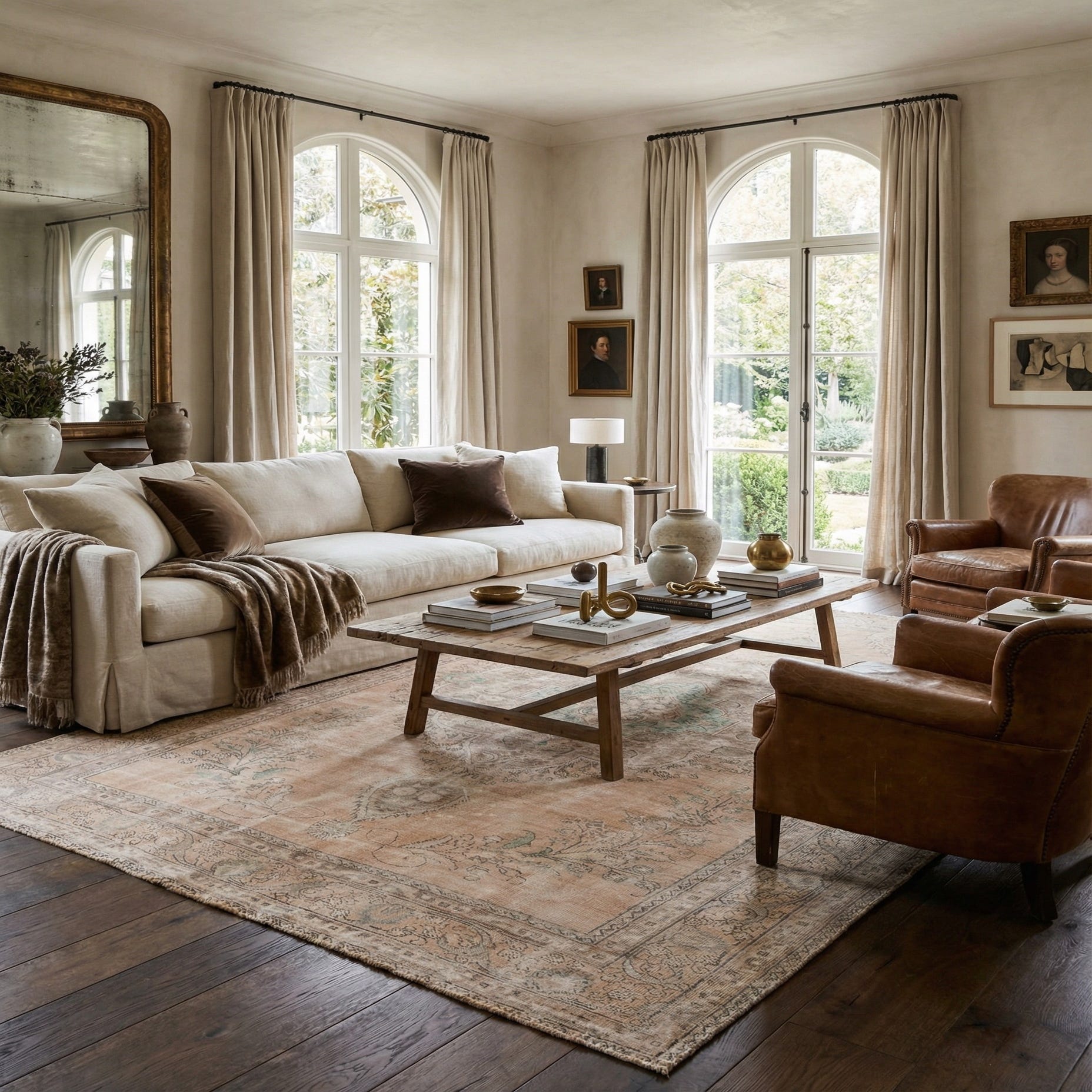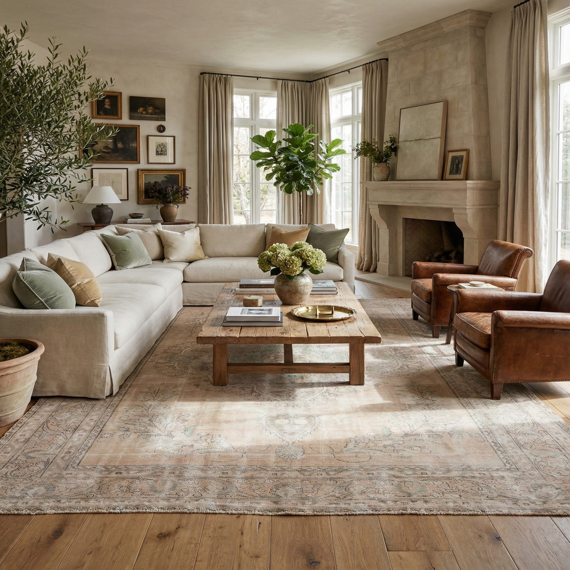 A 10x13 rectangular Ultra Vintage Persian rug in muted browns, tans, and creams with a central medallion and floral patterns.