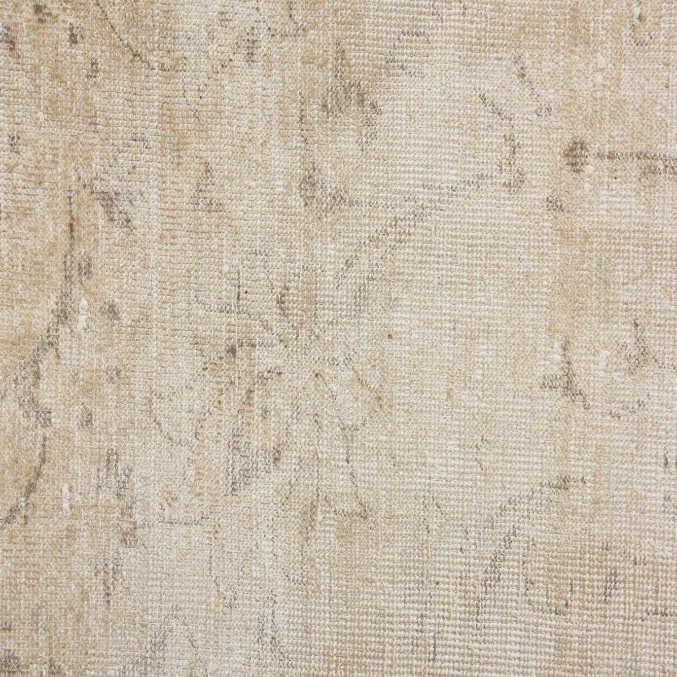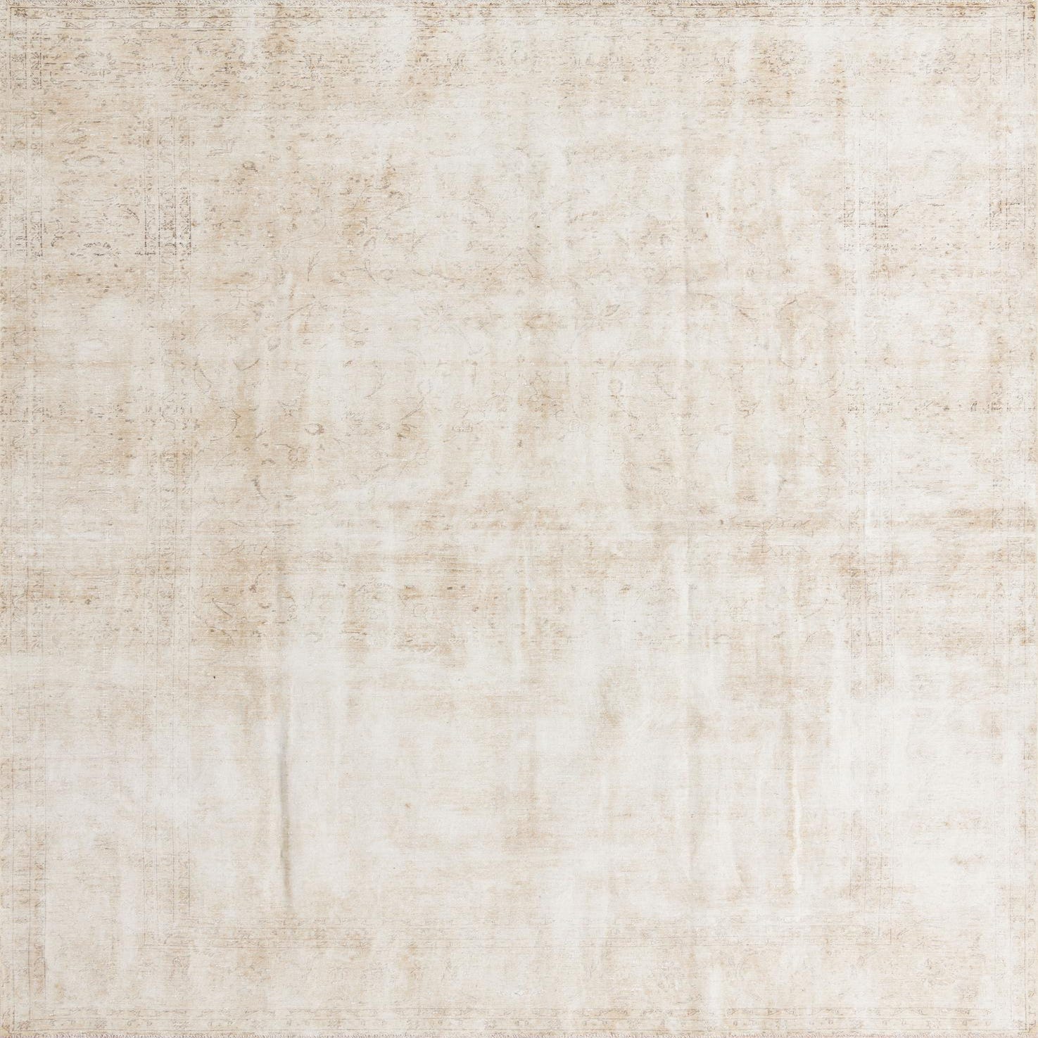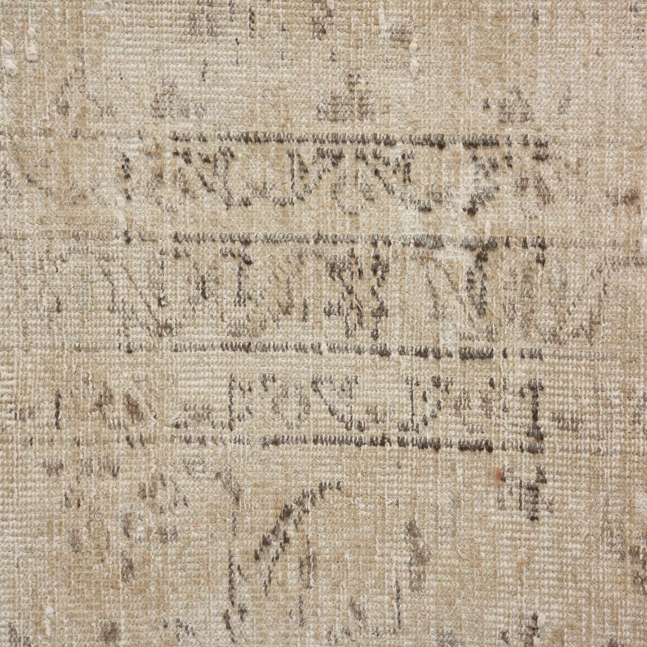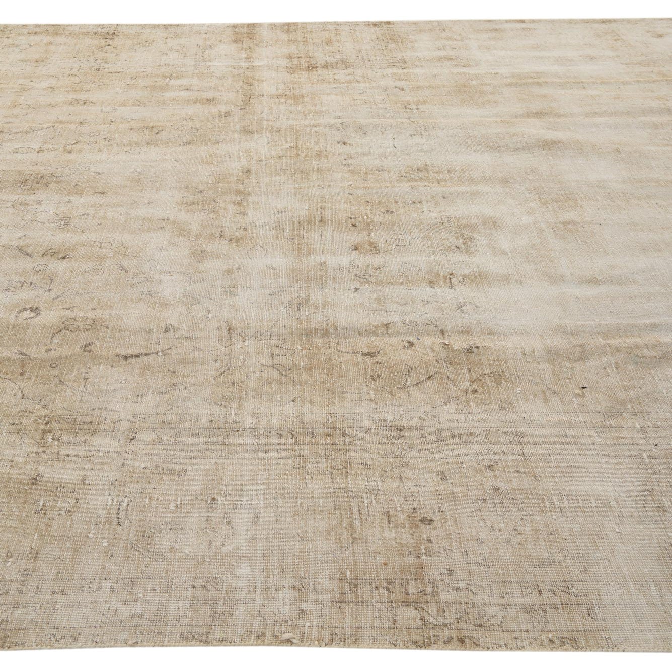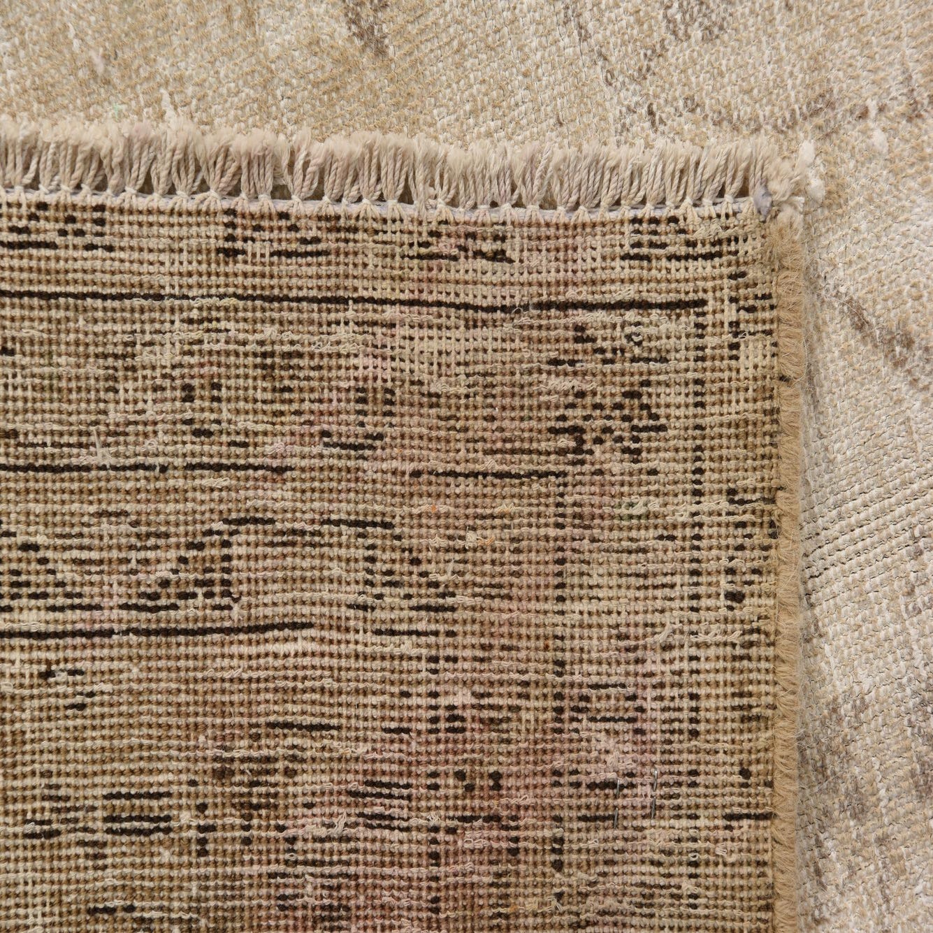 A soft beige field is gently overlaid with faded brown and ivory accents that create a worn, vintage-inspired pattern. Faint outlines of a central medallion and a lightly defined border emerge from the surface, giving the design an understated, timeworn character rather than high contrast. Hand-knotted 100% wool construction produces a dense, low-sheen pile with a soft, slightly firm hand and a subtle nap that catches light and adds depth to the neutral palette.