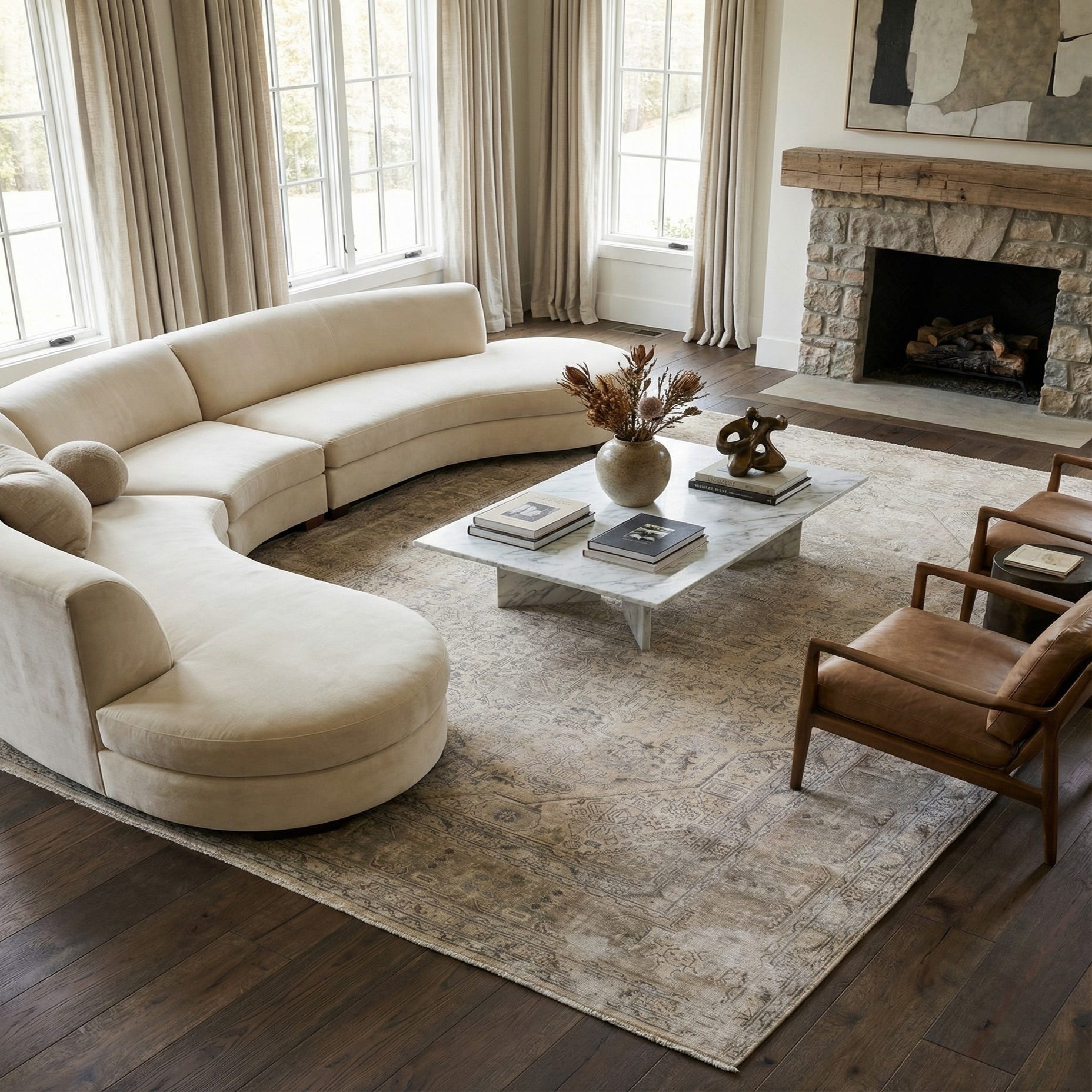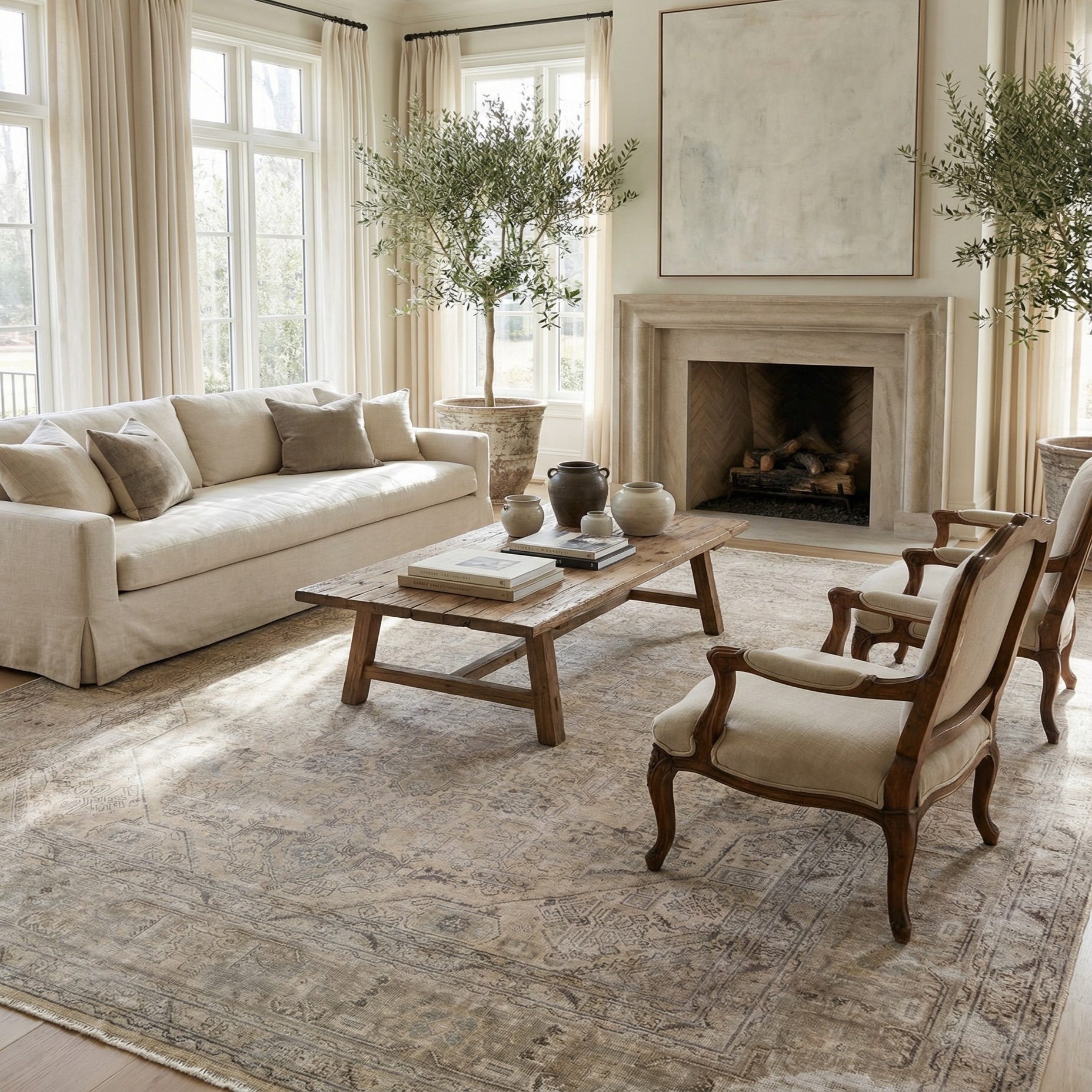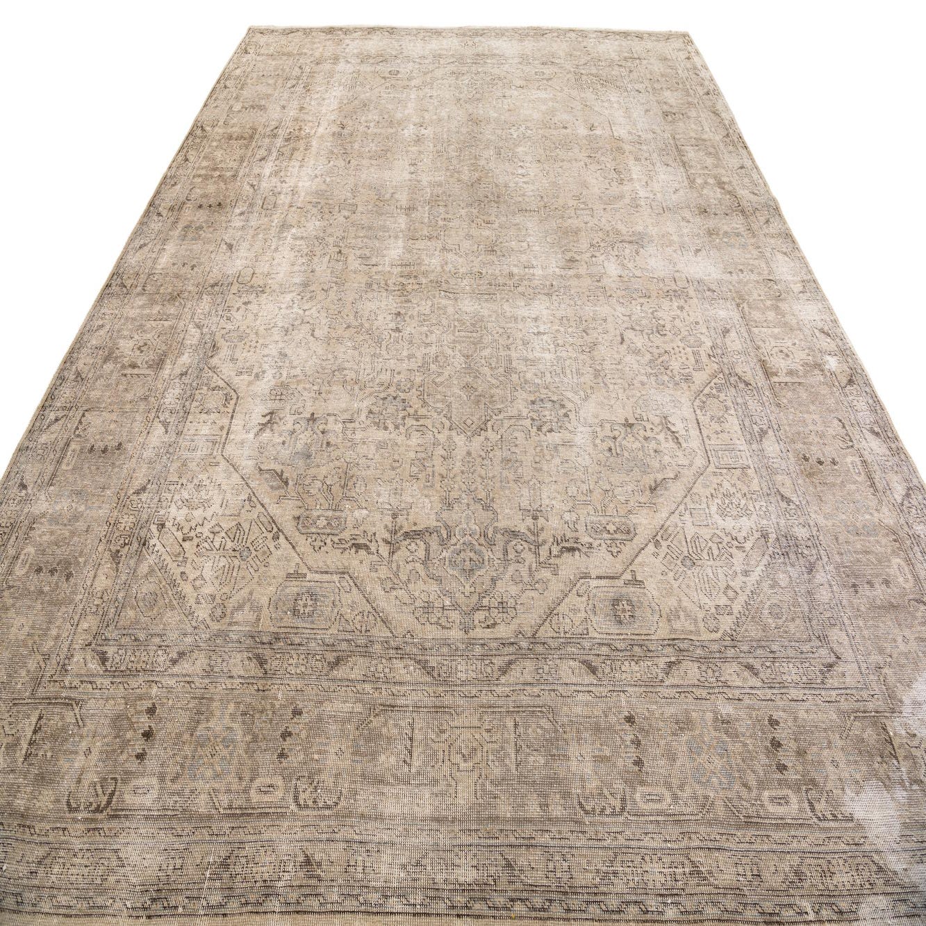 A 10x13 rectangular brown and tan Persian-style wool rug with a distressed medallion pattern, perfect for a living room.