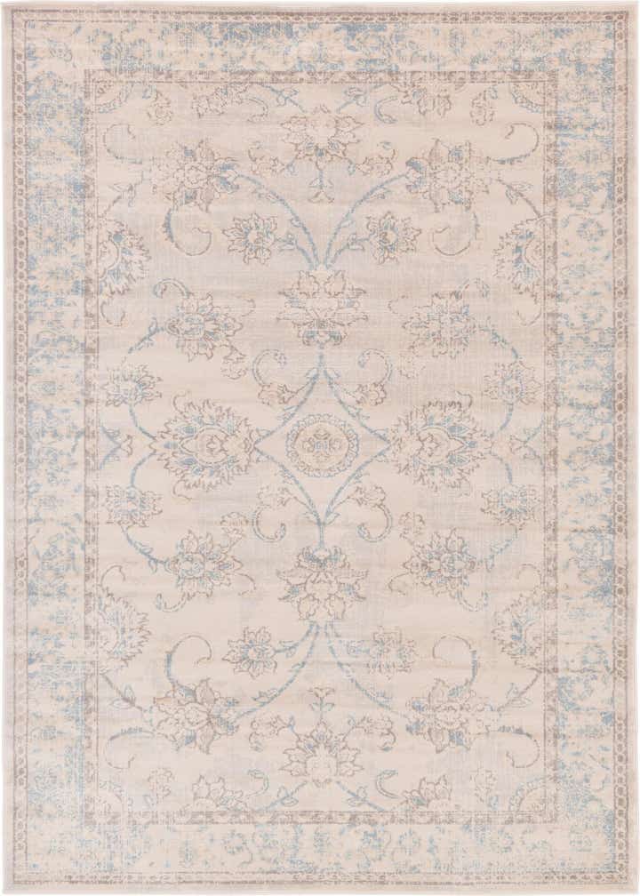 Primary color is Beige. Colors in this rug include: Beige, Blue, Gray, Light Brown.
