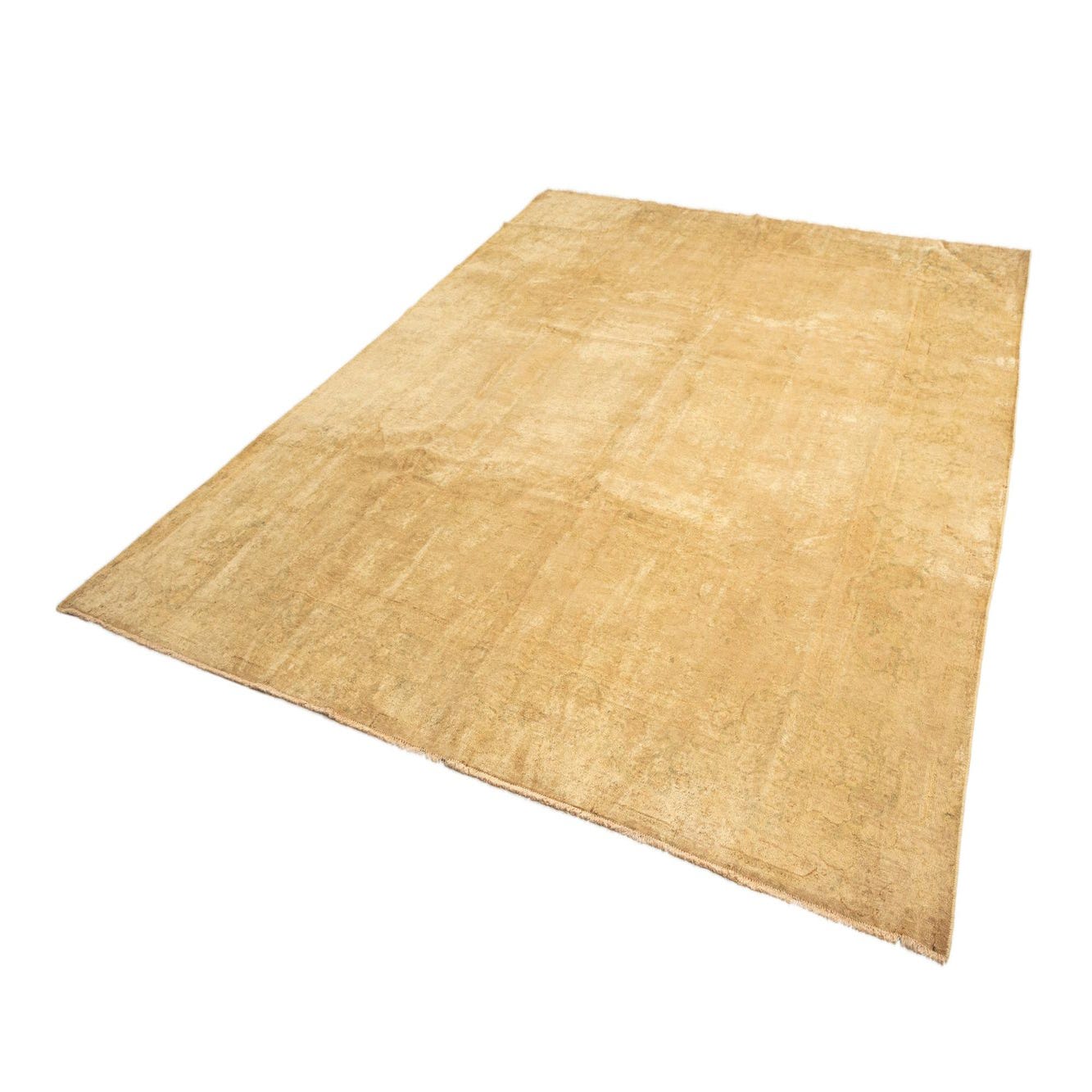 Handmade in wool, this rug has a warm beige ground with softly aged character and low-contrast patterning. The central field is open and gently variegated, with faint, antiqued motifs and a subtle border that blends into the background for a calmly distressed look. Running your hand across the surface reveals a dense, velvety wool pile with a soft nap that catches light and adds a touch of tactile warmth underfoot.