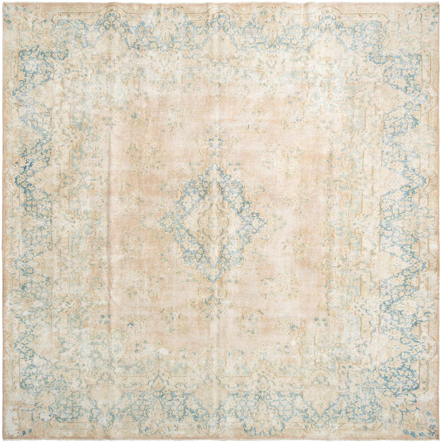 A 10x13 rectangular Persian-style wool rug with a distressed brown and ivory background and light blue intricate floral patterns.