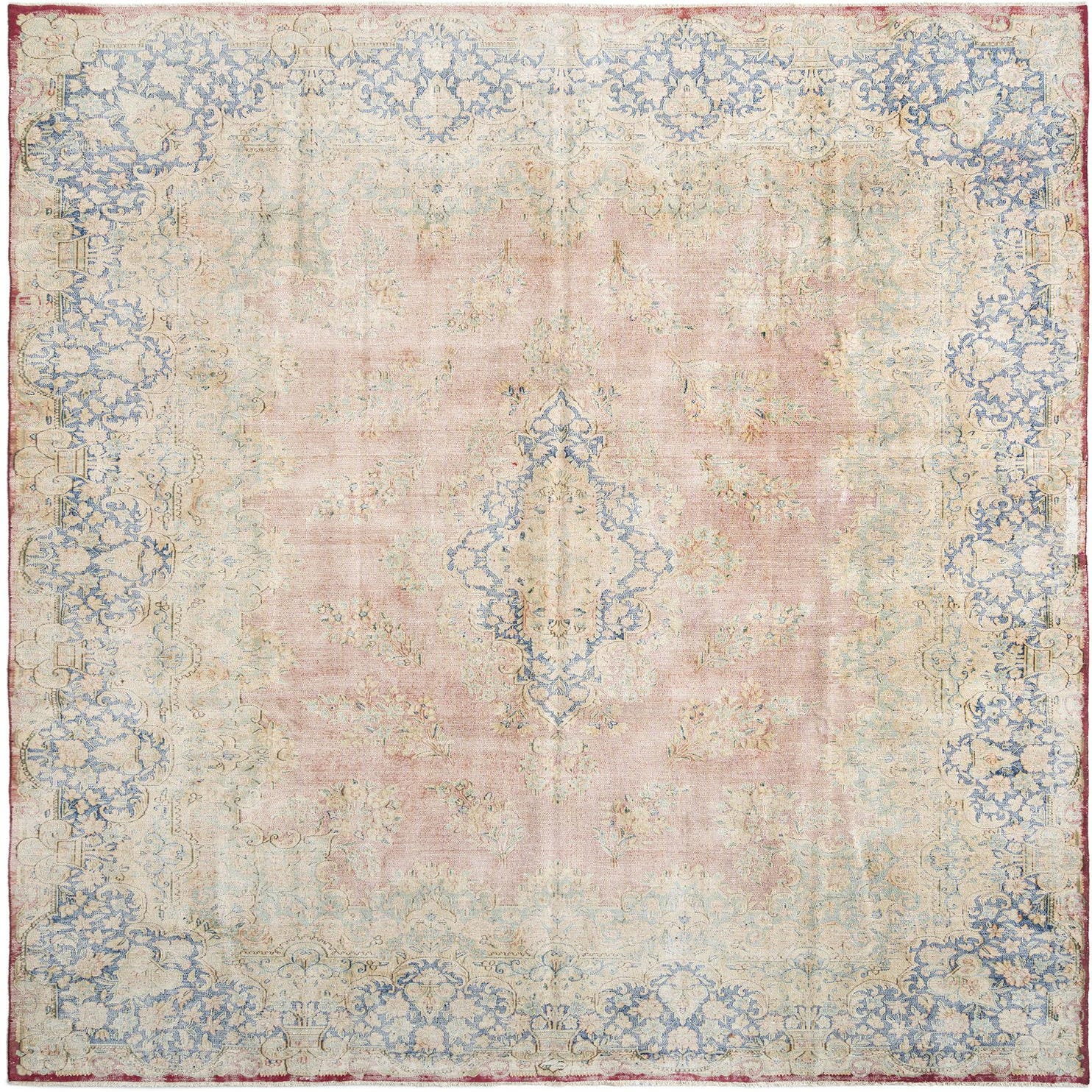 A large 10x13 rectangular Persian rug with a faded pink and brown field, featuring intricate ivory and blue floral patterns.