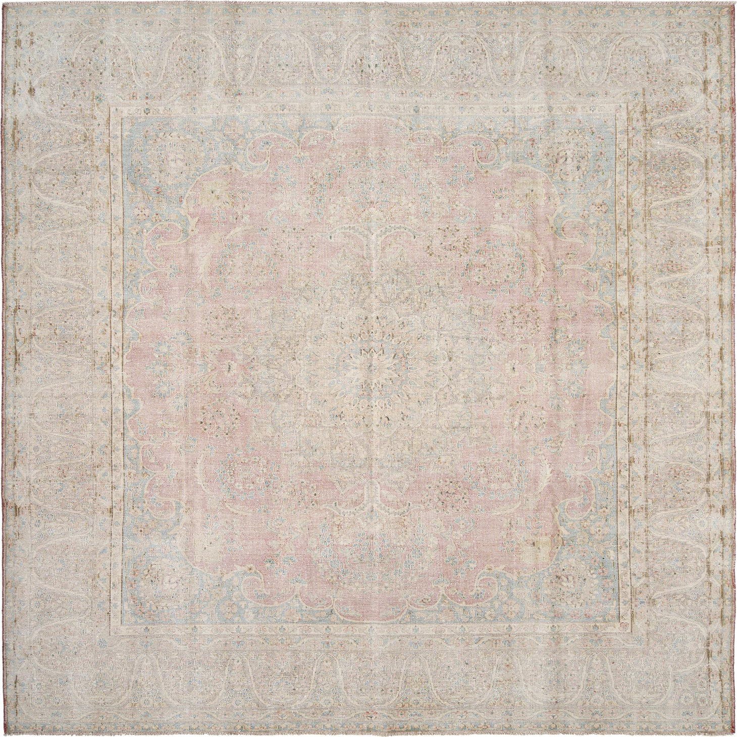 A 10x13 rectangular Persian rug in muted browns, tans, and ivories with a subtle pink central medallion, ideal for a living room.