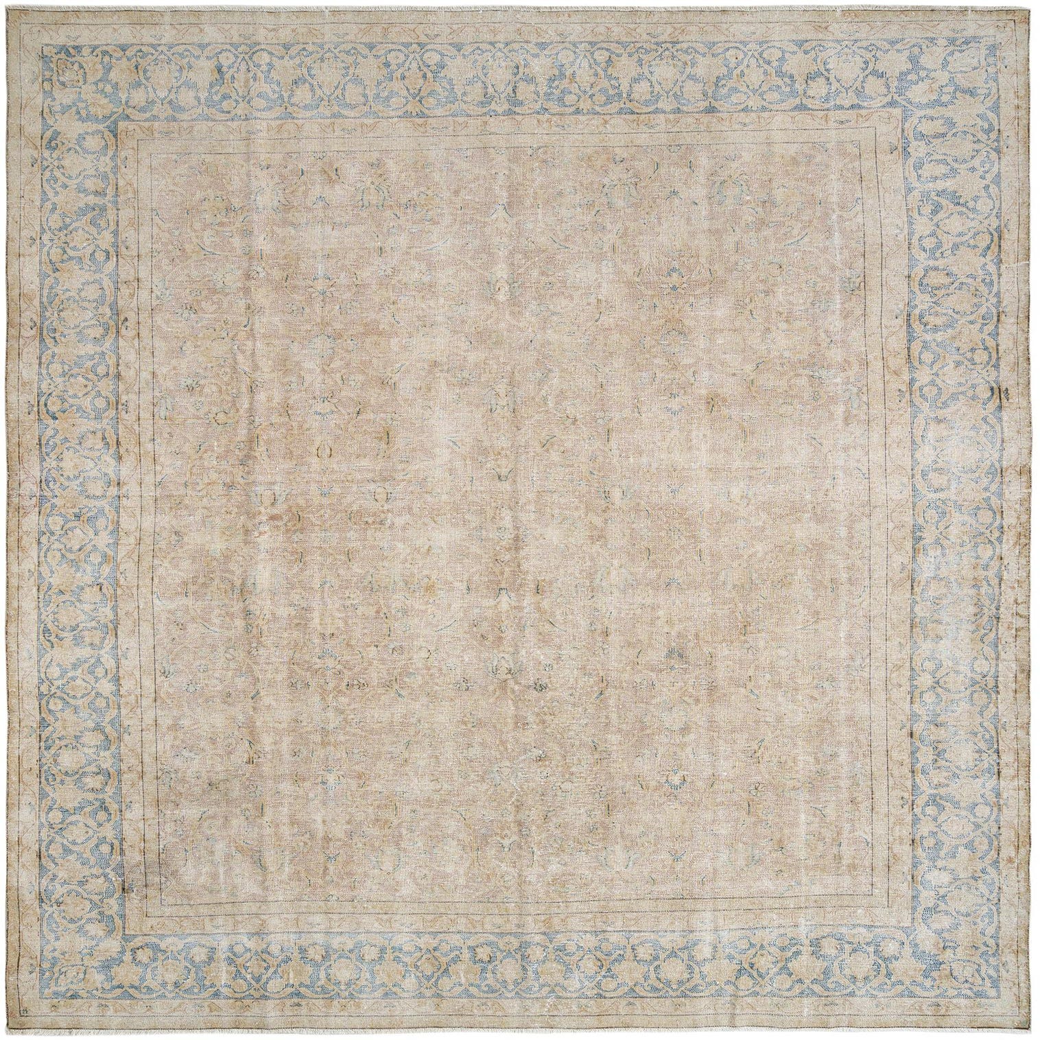 A 10x13 rectangular Persian rug with a faded tan and brown field and an intricate light blue border.