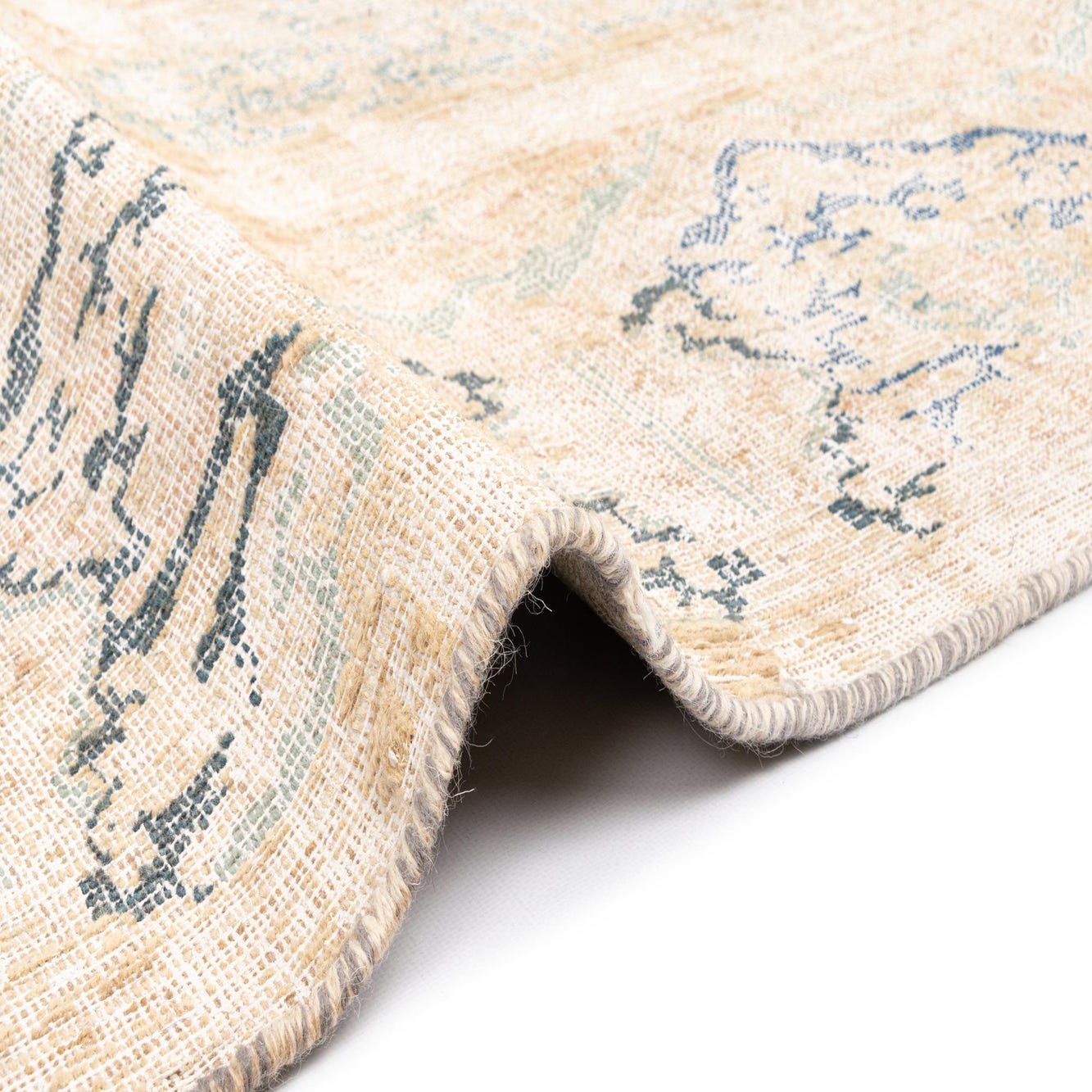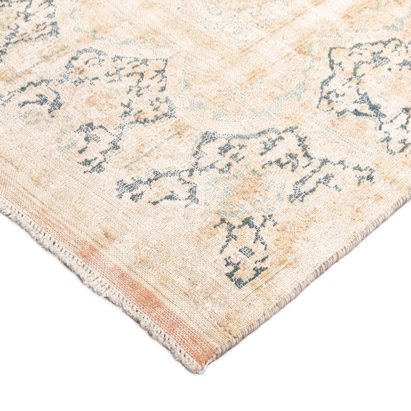 A 10x13 rectangular Persian rug featuring a faded rose pink medallion on a distressed ivory and tan field with blue accents.