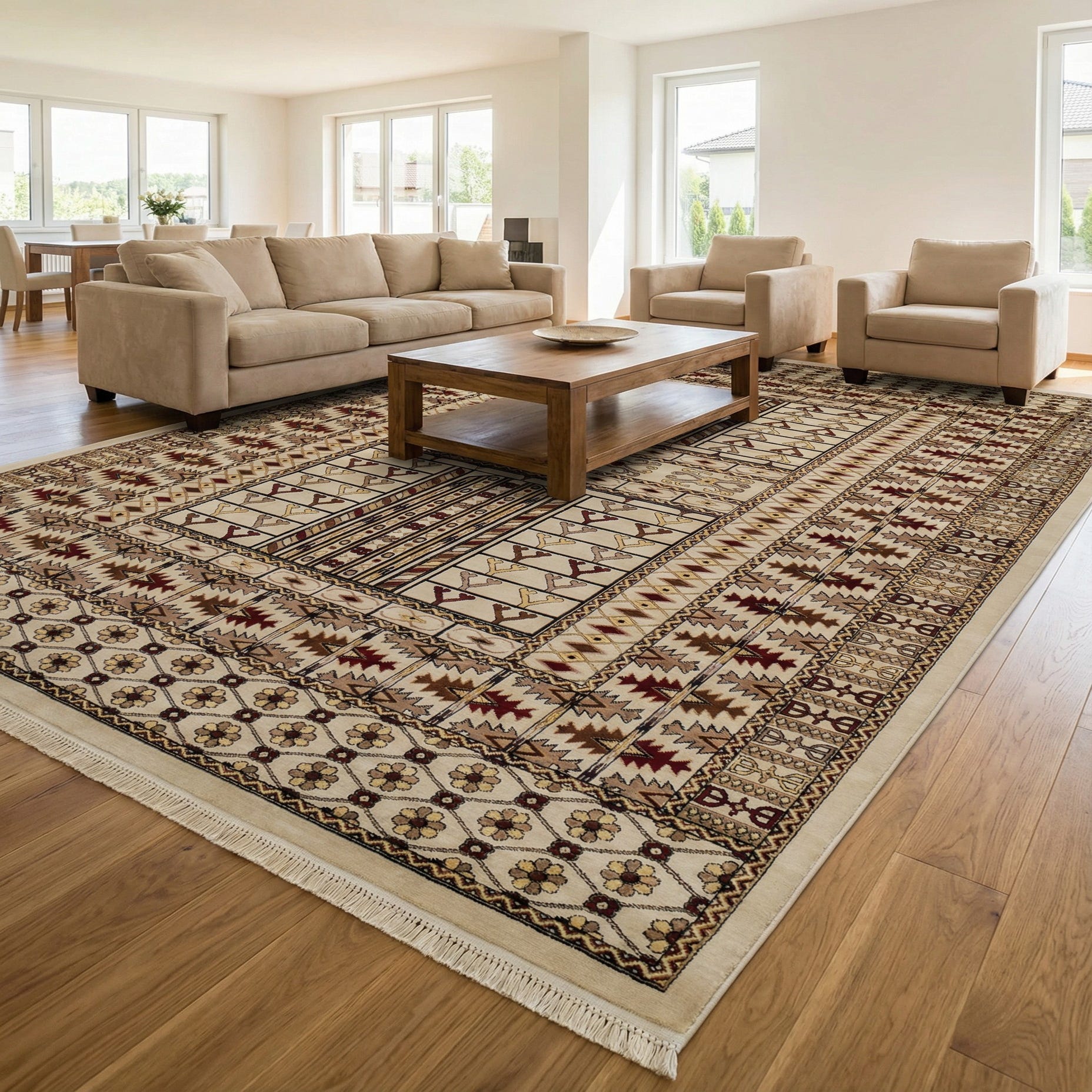 A structured, traditional pattern sits on a warm beige background, where repeating hooked and tree-like motifs in black, brown, red and yellow form a balanced central field. Multiple borders frame the design with serrated zigzags, geometric bands and a narrow floral rosette edge that keeps the overall look orderly and refined. Machine-made from 100% polypropylene, the rug has a low, dense pile with a smooth hand and slight sheen; the tight construction preserves crisp pattern detail and gives the surface a consistent, even feel underfoot.