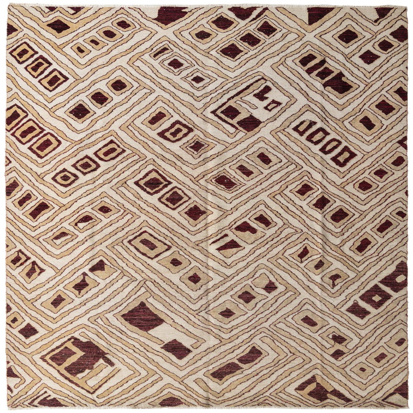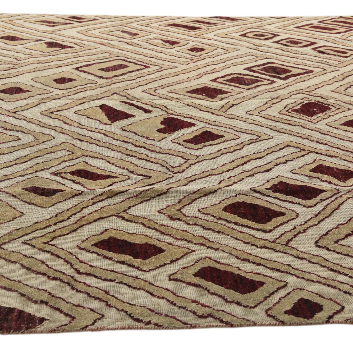 This Darya collection rug is a hand-knotted 10x14 piece crafted from 100% wool, offering both durability and a soft, plush texture underfoot. The pattern features a contemporary geometric motif with crisp, angular lines that create an engaging lattice design throughout the beige backdrop. The pattern is highlighted with ivory and contrasting shades of burgundy, adding both depth and visual interest to the overall design.
