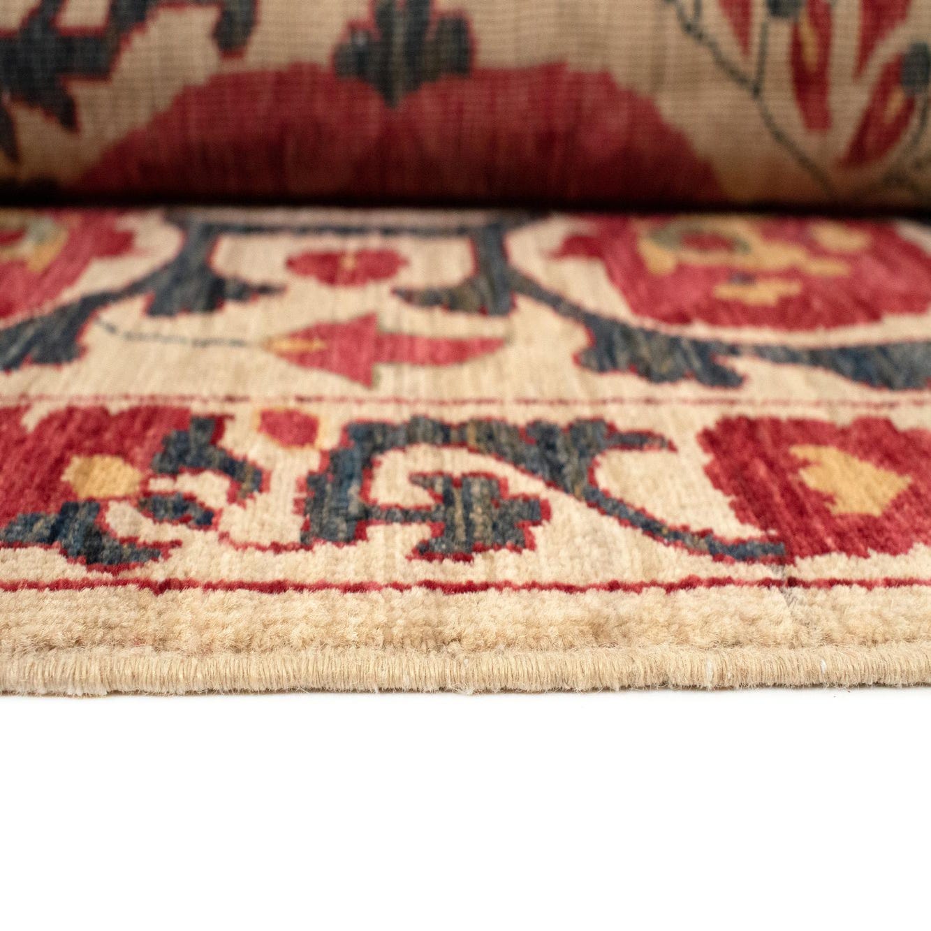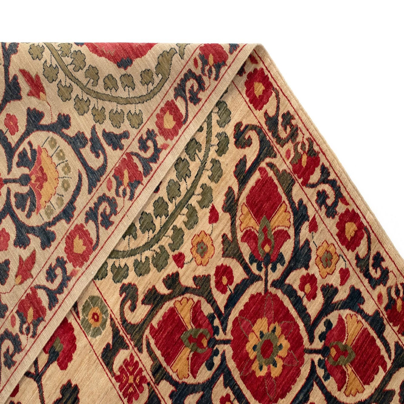 The Farahan collection presents a hand-made 100% wool rug, sized at an ample 10x14 feet, exhibiting a sophisticated design suited to a variety of interior settings. This rug features a Beige background, providing a neutral canvas enriched by an intricate pattern incorporating shades of Blue, Red, and Yellow. Varied floral medallions dominate the visual landscape, interspersed with botanical motifs and accentuated by detailed borders that lend the piece a sense of structure.