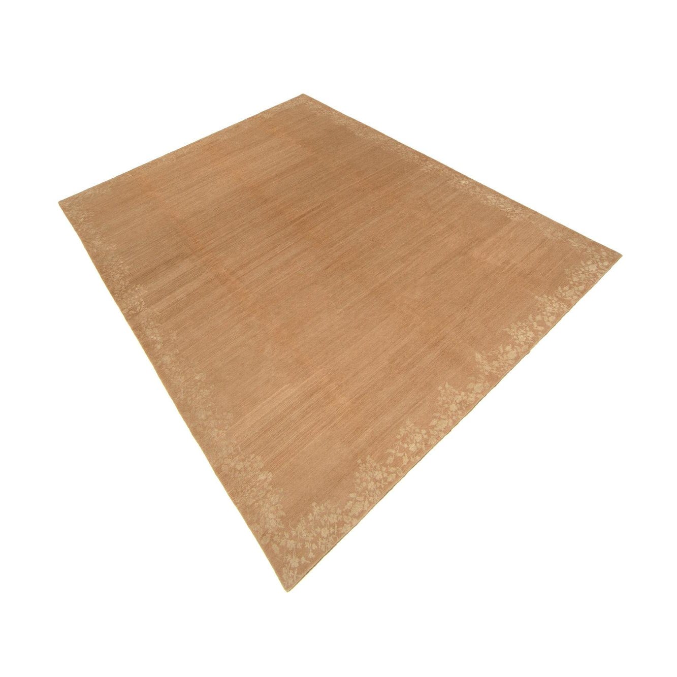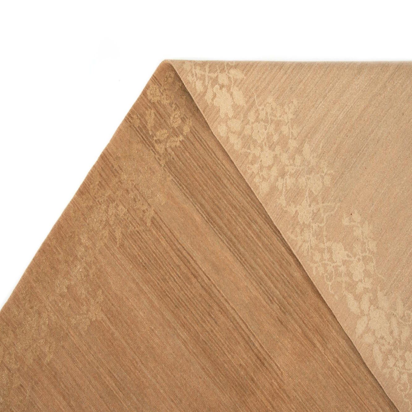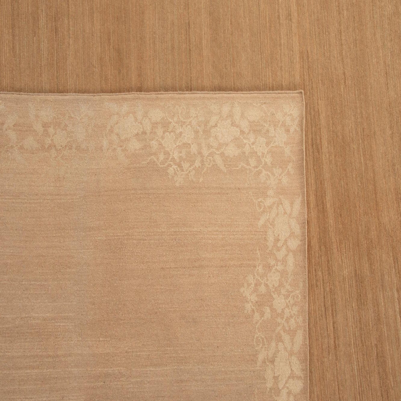A warm beige field anchors this hand-made wool and silk rug, its surface showing gentle, horizontal striations that give the piece a quiet, lived-in look. A narrow floral vine border in a paler beige traces the edges, providing a subtle decorative frame without interrupting the calm, open center. The wool pile feels soft and substantial underfoot while silk highlights catch the light, adding a low, refined sheen and a slightly smoother hand along the motifs.