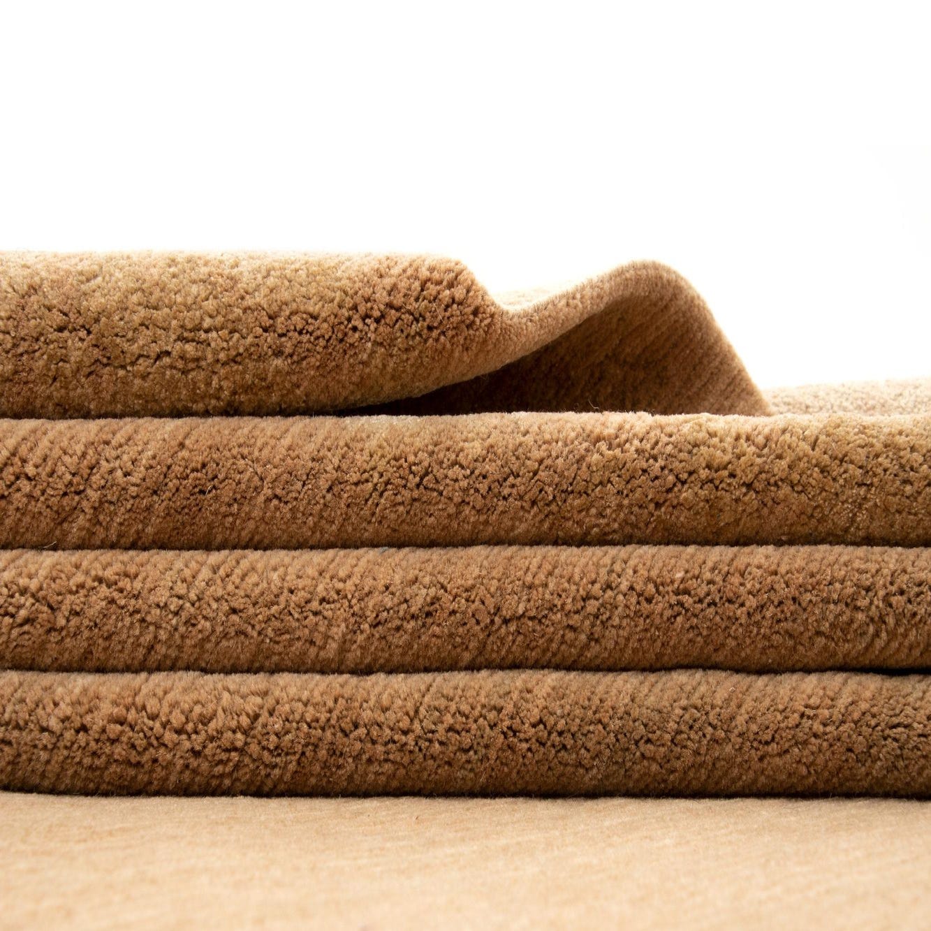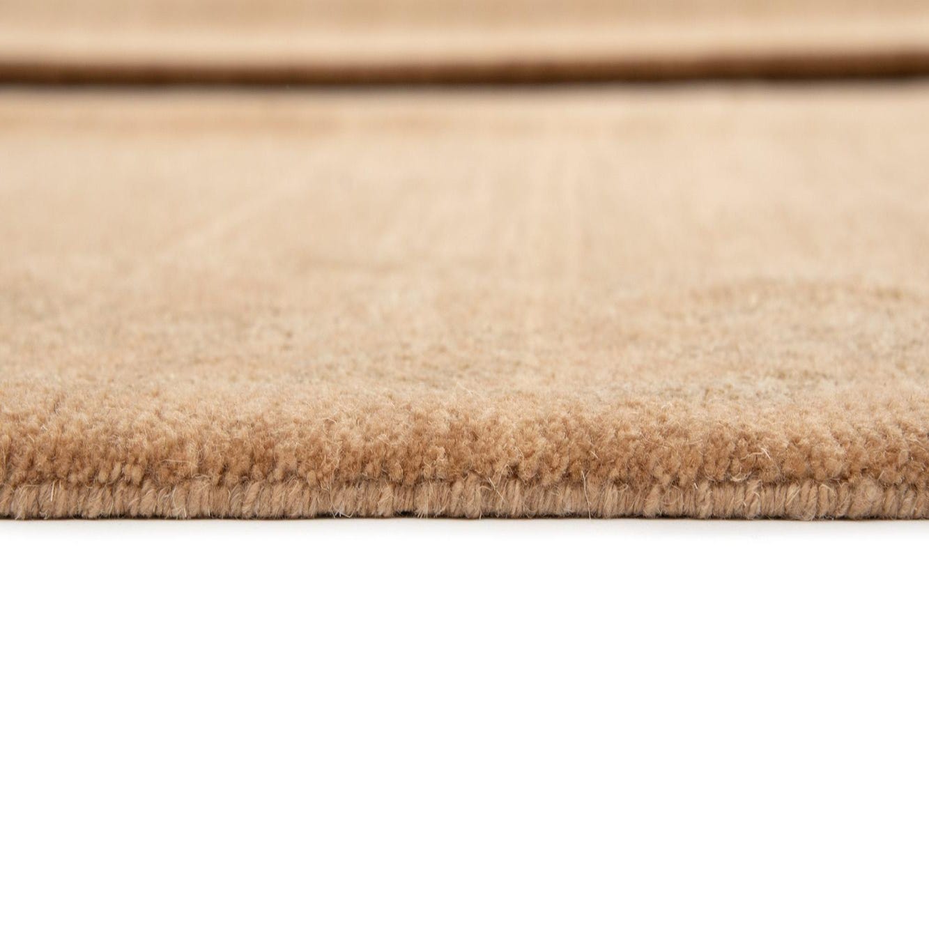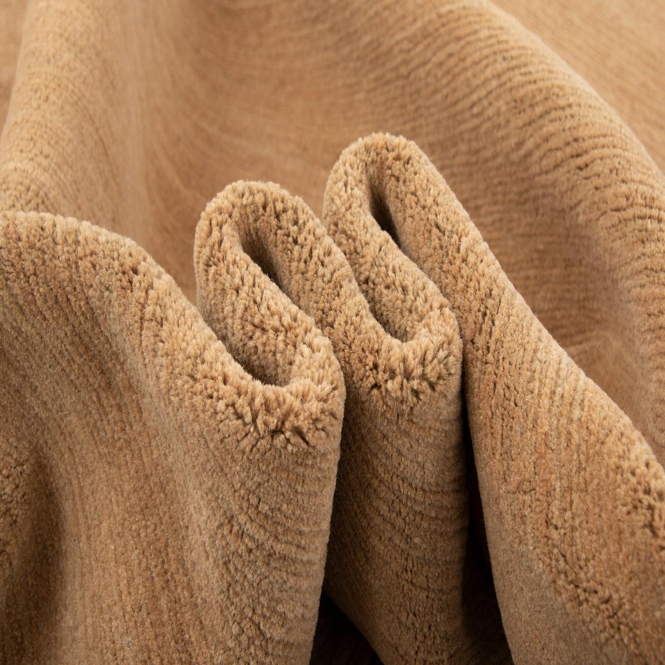 A warm beige field anchors this hand-made wool and silk rug, its surface showing gentle, horizontal striations that give the piece a quiet, lived-in look. A narrow floral vine border in a paler beige traces the edges, providing a subtle decorative frame without interrupting the calm, open center. The wool pile feels soft and substantial underfoot while silk highlights catch the light, adding a low, refined sheen and a slightly smoother hand along the motifs.