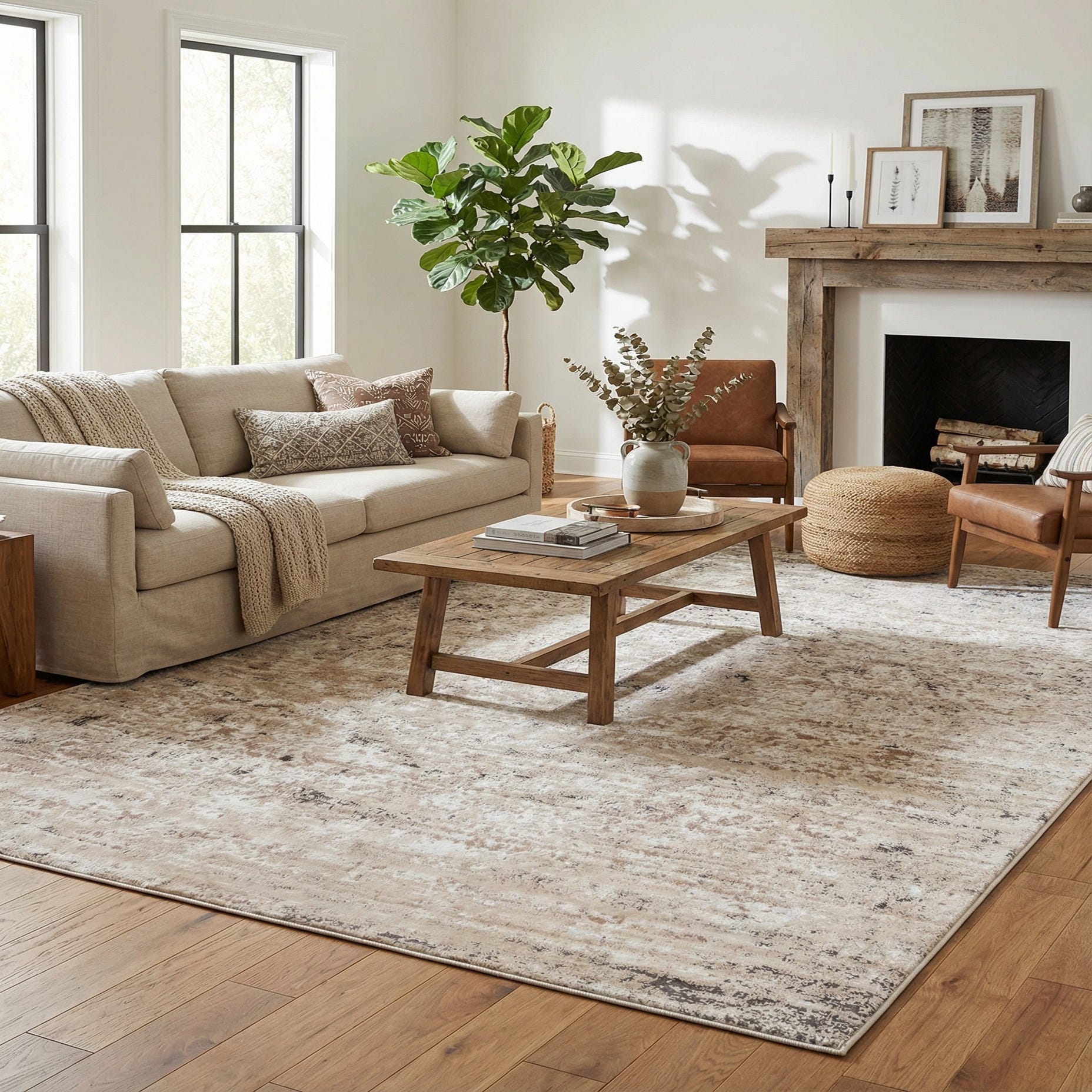 This neutral palette and painterly pattern fit a range of interiors: place it beneath a seating group to anchor a living room with linen upholstery and natural wood tones, set it under a dining table to unify an open-plan space, or use it in a bedroom to soften hardwood floors. It complements transitional, modern farmhouse, coastal, and Scandinavian schemes, and pairs well with matte metal accents, woven textures, and layered rugs for added depth.