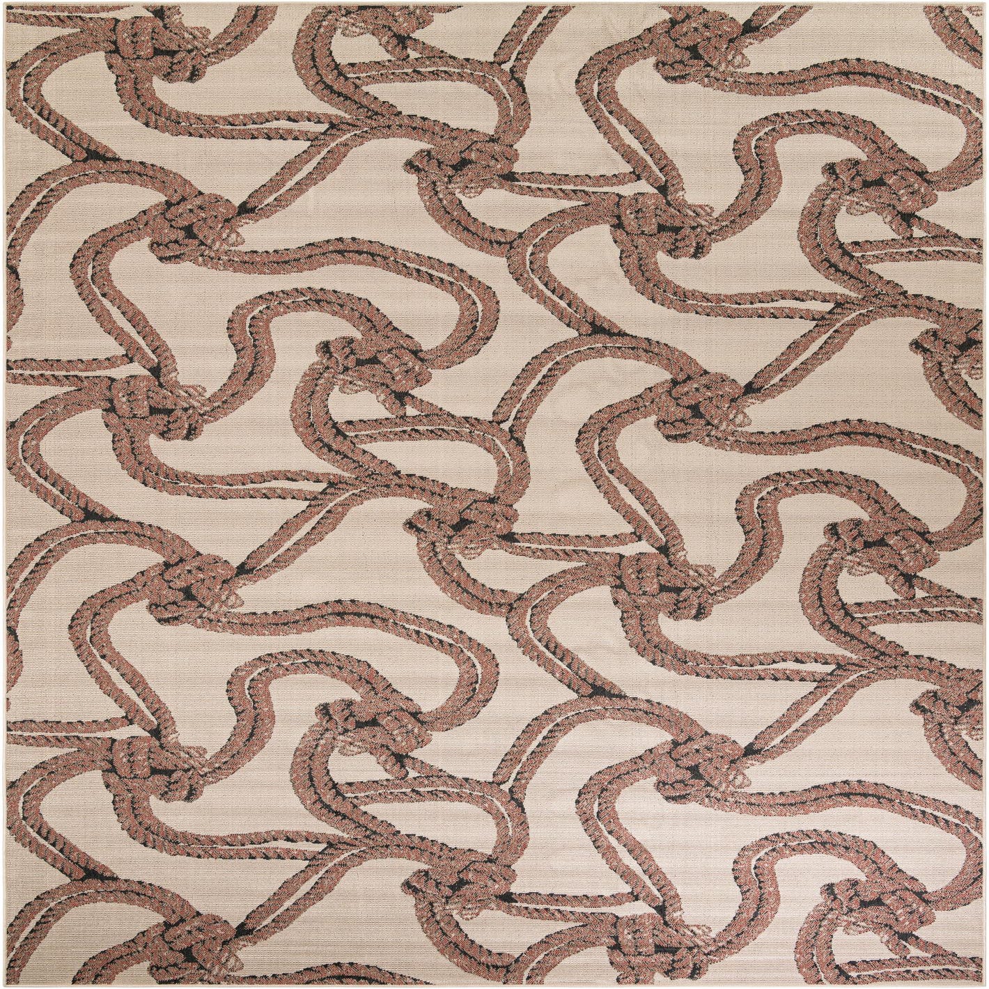 A 10x14 rectangular indoor/outdoor rug with a repeating brown nautical rope and knot pattern on an ivory background.