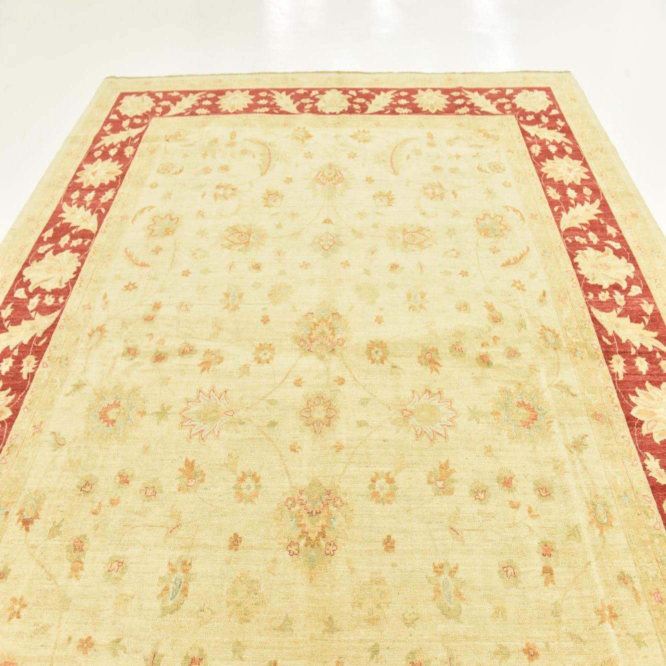 A 10x14 rectangular Peshawar Ziegler rug featuring a cream field with subtle botanical patterns and a wide red-brown border with floral motifs.