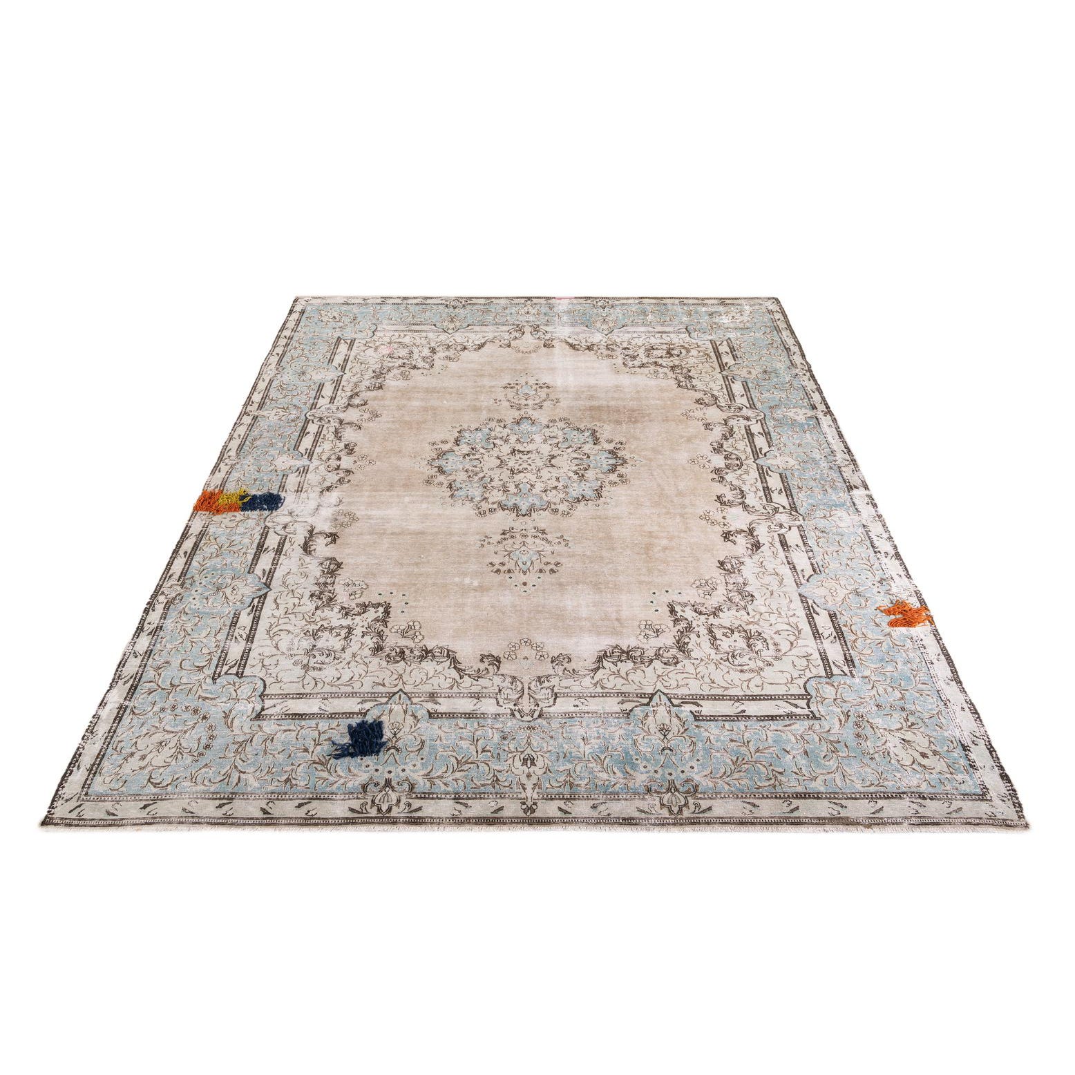A 10x14 rectangular Ultra Vintage rug featuring an ivory and tan distressed Persian medallion pattern with light blue accents.