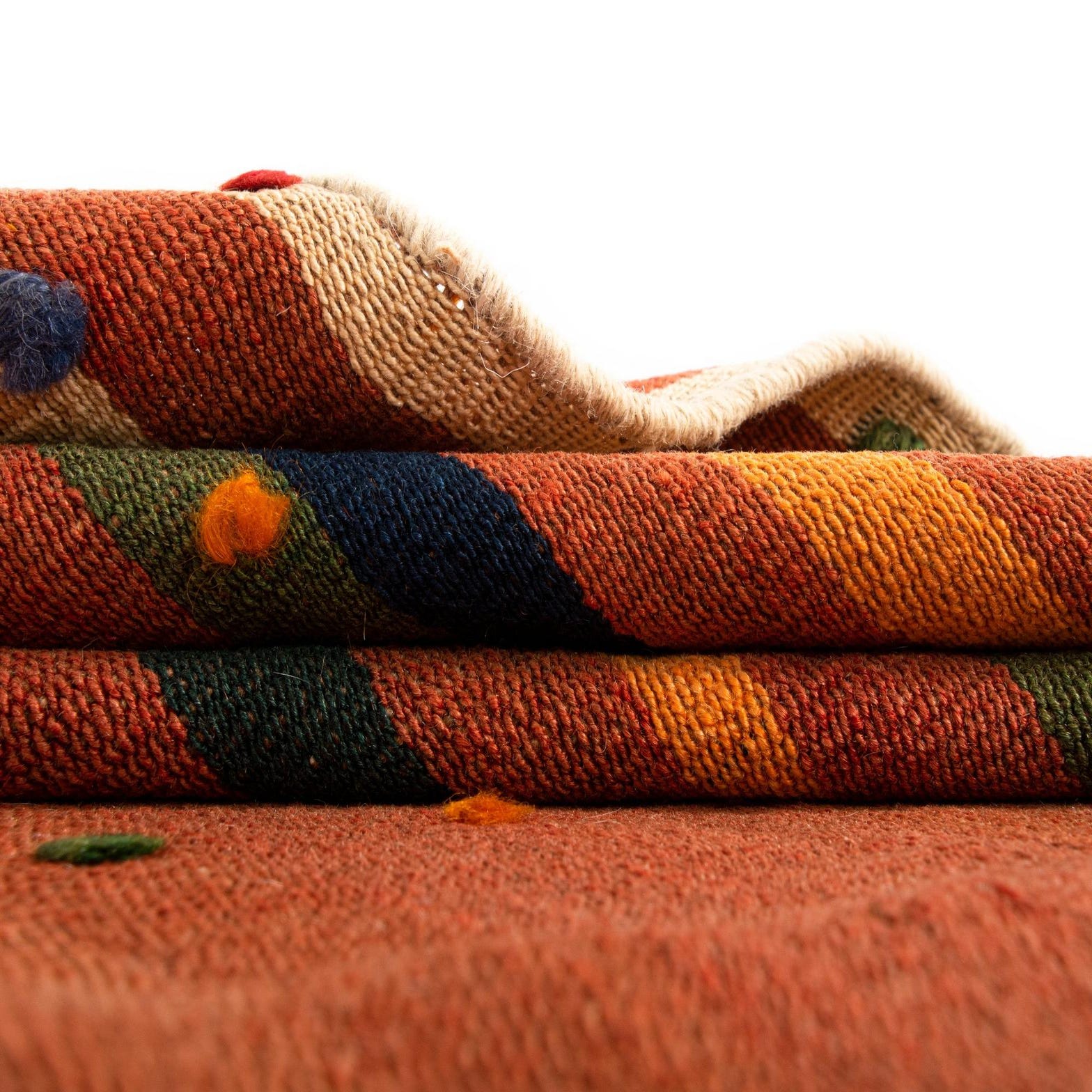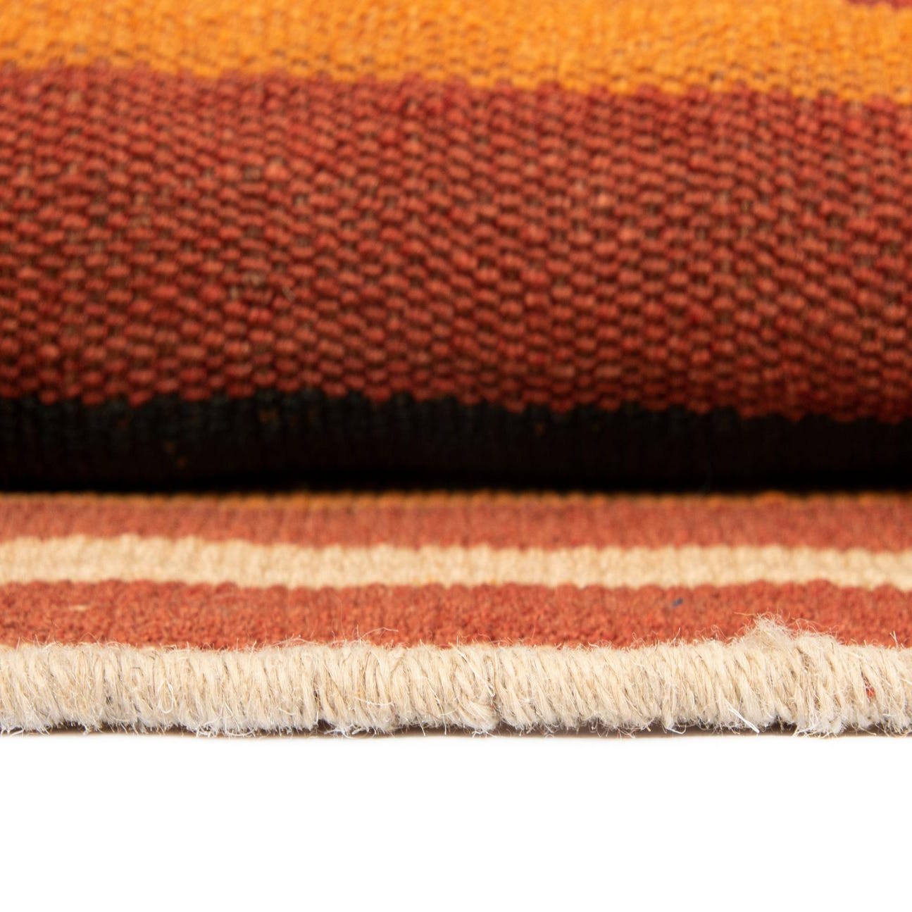 The Jajim collection presents a handcrafted 11 ft runner rug, masterfully woven from 100% wool. This rug features a beige background, overlaid with a vibrant array of linear patterns in a judicious selection of earth tones and bright accents. The distinctive stripes are aligned in a regular sequence, interrupted by subtle pops of color that give the piece a sense of playful spontaneity. The texture is naturally inviting and rich, indicative of its all-woolen construction.