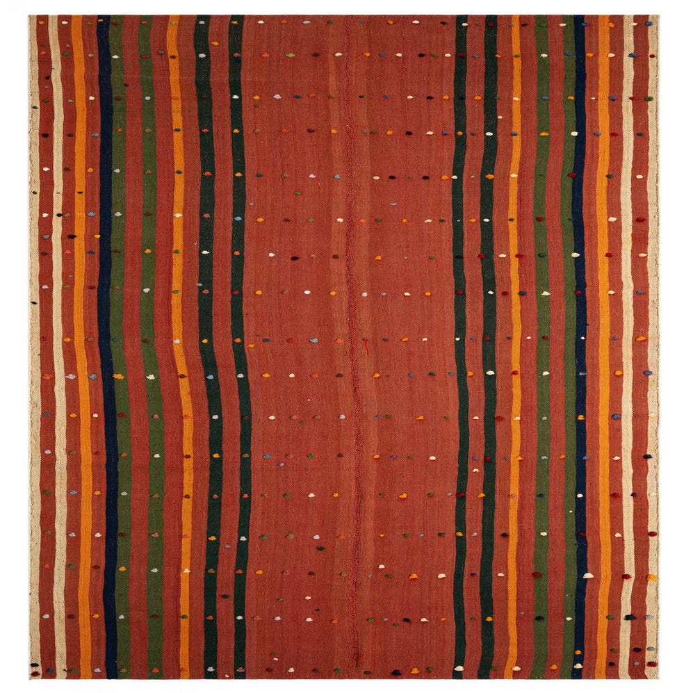 A handmade 11 ft Jajim runner rug in warm brown with colorful vertical stripes and playful polka dots.