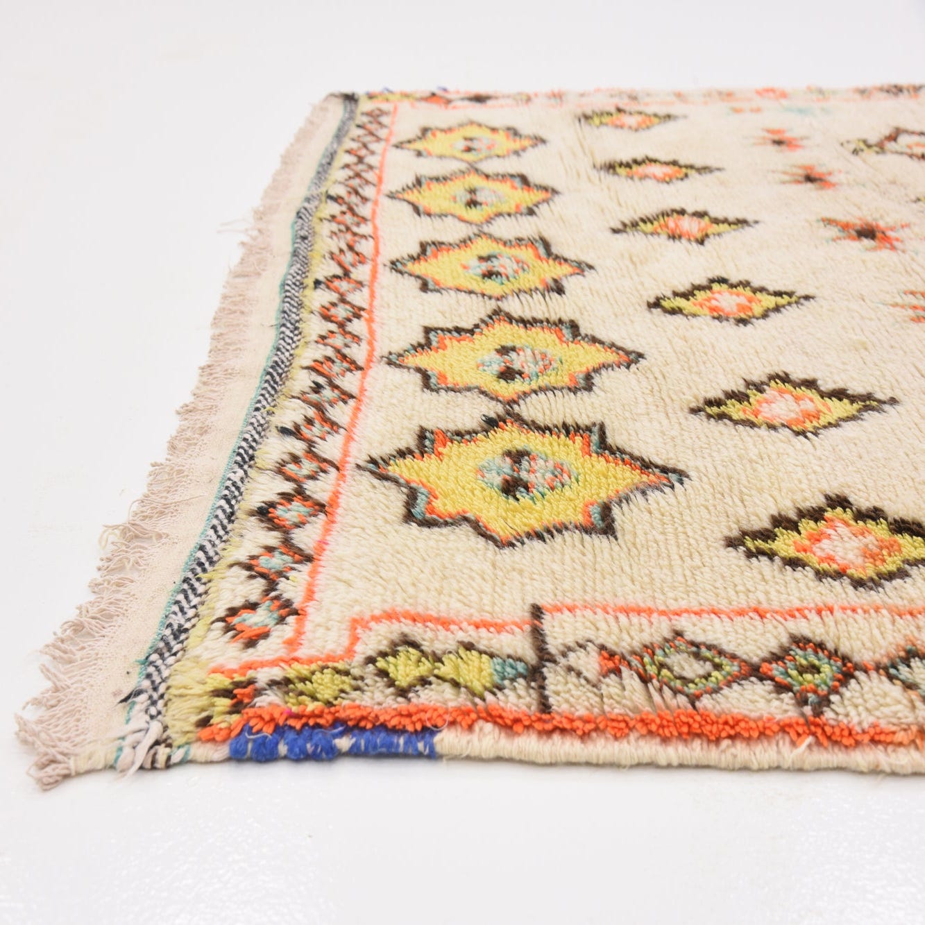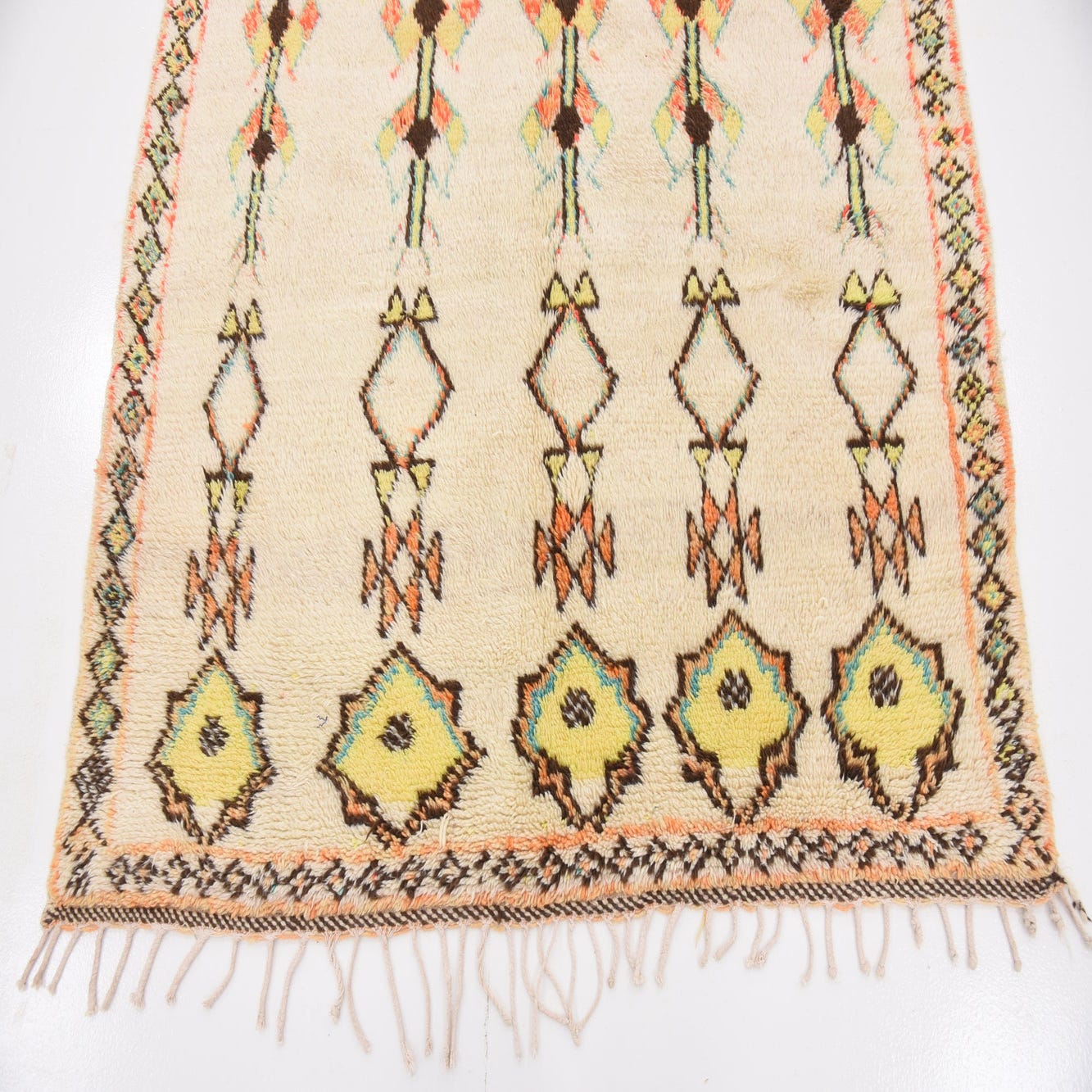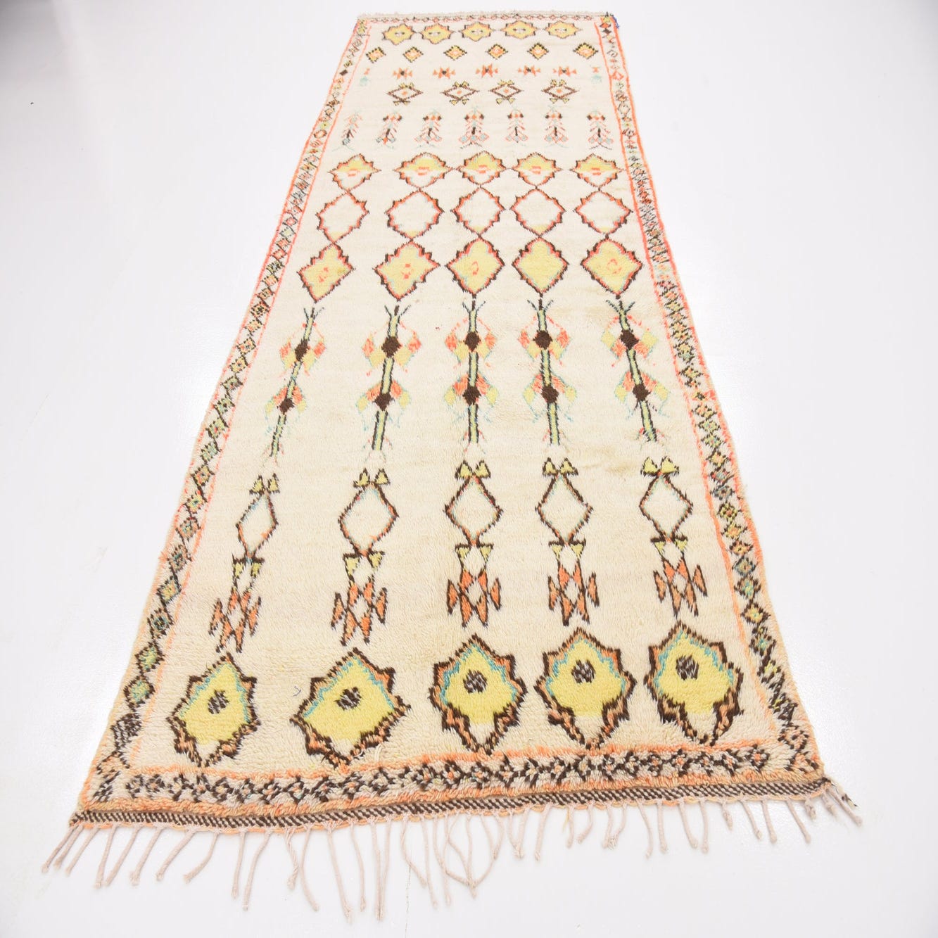 A handmade 11 ft Moroccan runner rug featuring a cream background with tribal patterns in brown, tan, yellow, and orange.