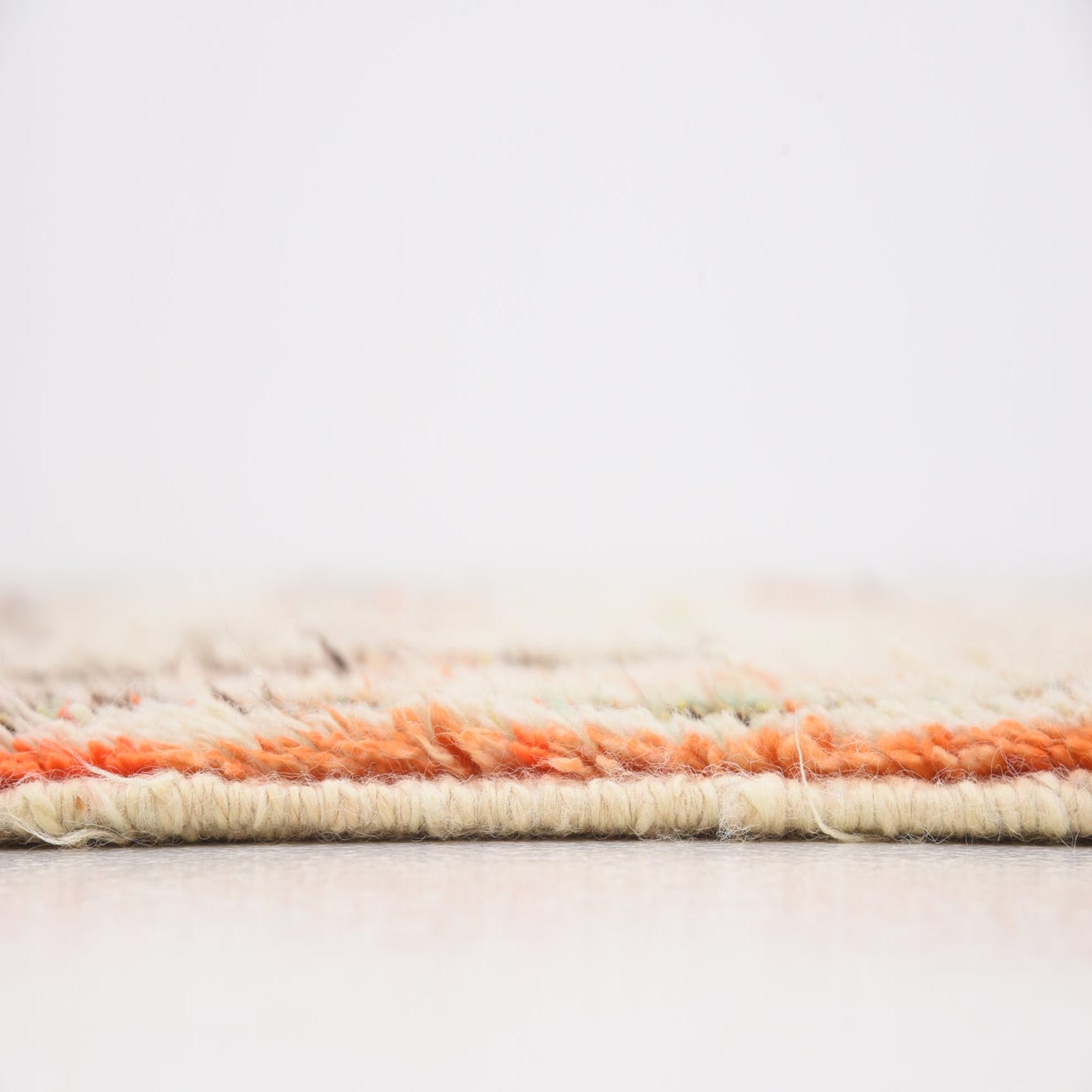 The Moroccan Collection offers a 11 Ft Runner rug, hand-knotted from 100% wool, ensuring a durable and soft texture underfoot. This piece showcases a classic beige background, highlighted with an engaging array of colors including brown, orange, peach, turquoise, yellow, and ivory. The design features traditional geometric motifs and tribal patterns that bring an element of global inspiration to any interior space.
