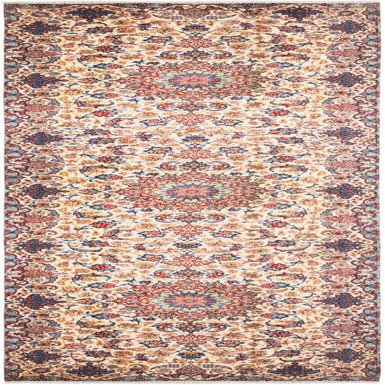 Primary color is Beige. Colors in this rug include: Beige, Black, Blue, Brown, Red, Yellow, Orange.