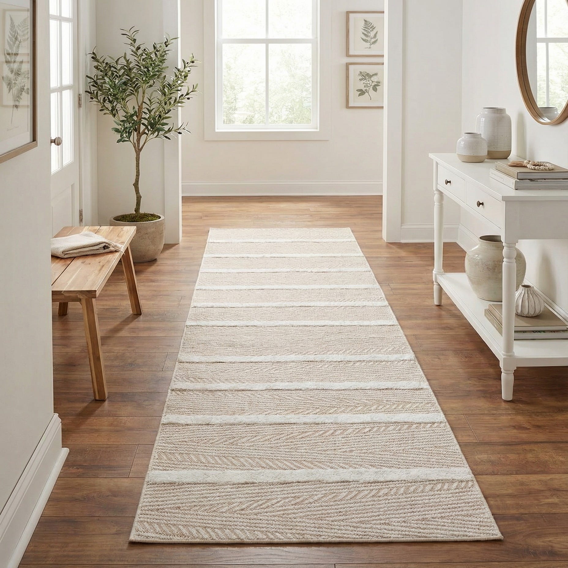 Machine-made of 100% cotton, the flat-woven body feels soft underfoot while the raised ivory bands add gentle dimension and a pleasing hand. Use this runner in an entry or hallway to guide a path, layer it at the foot of a bed for added texture, or place it along a kitchen galley for a softer surface underfoot. It complements light wood flooring, linen upholstery, woven accents, and suits Scandinavian, coastal, modern farmhouse, or minimalist interiors that favor natural materials and subdued color palettes.