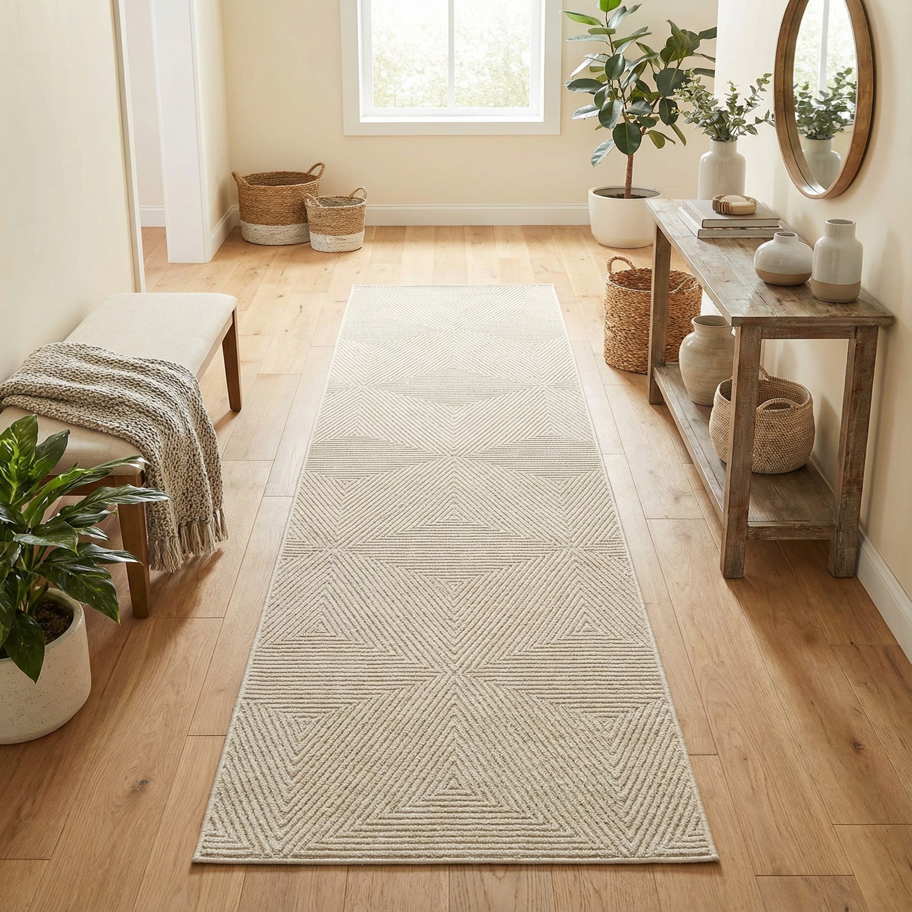 A soft, low-profile runner woven on a warm beige background with a delicate geometric motif of concentric triangles and linear ribbing. Ivory highlights trace the pattern, creating gentle contrast and a sense of depth without bold color shifts. Machine made from 100% polypropylene, the construction feels tightly woven and slightly textured underfoot, offering a tailored, clean appearance well suited to indoor-outdoor settings.