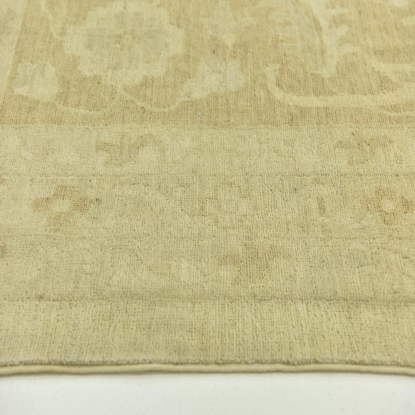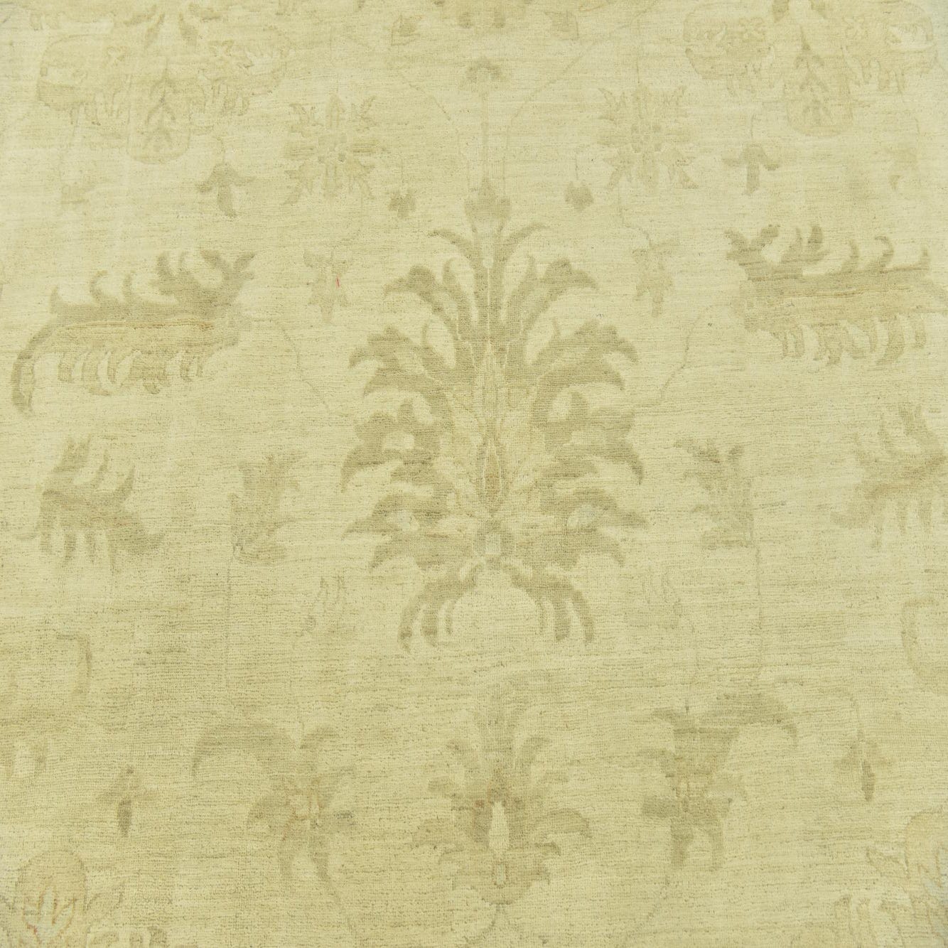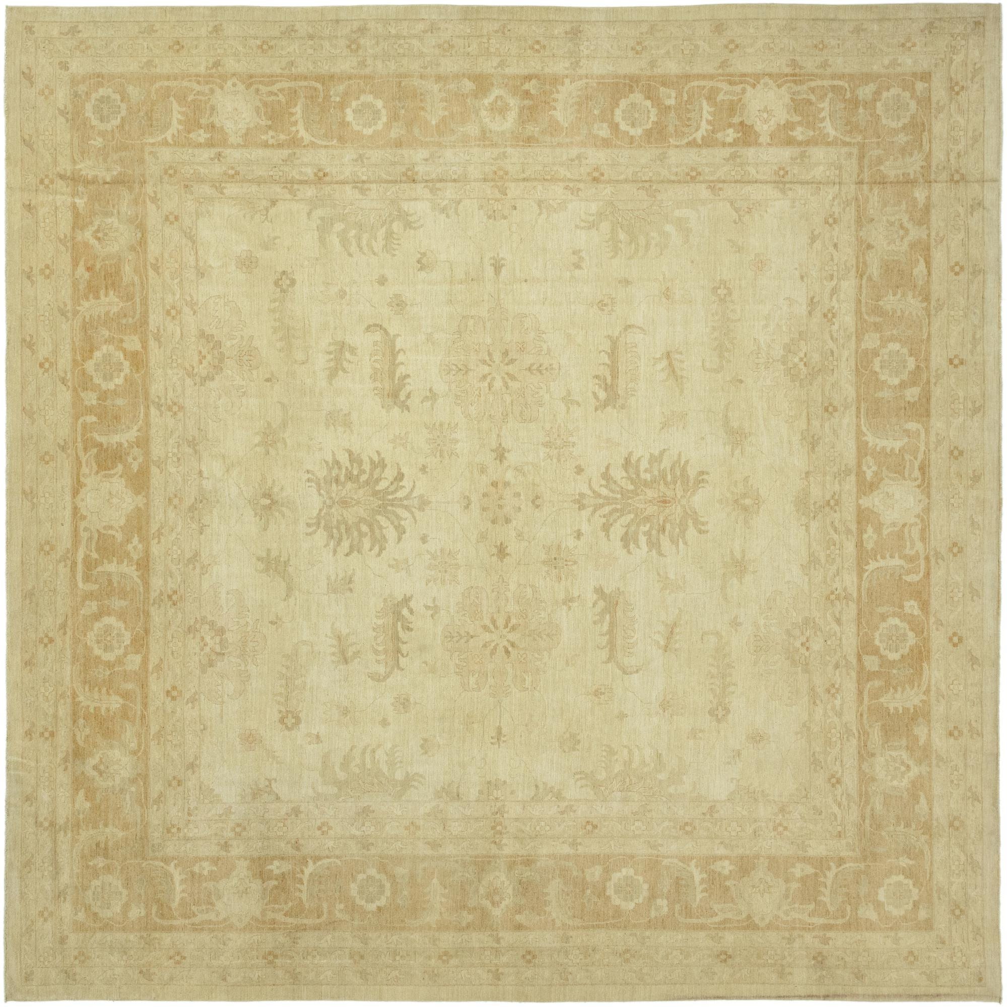 This Peshawar Ziegler rug is a hand-knotted piece, crafted with 100% hand-spun wool, offering a durable and texturally rich addition to any room. It measures a substantial 12 feet square, making it an ideal choice for anchoring larger spaces or defining seating areas within an open-plan setting. The rug features a predominantly beige background, complemented by accents in light brown, which together present a neutral yet warm color palette.