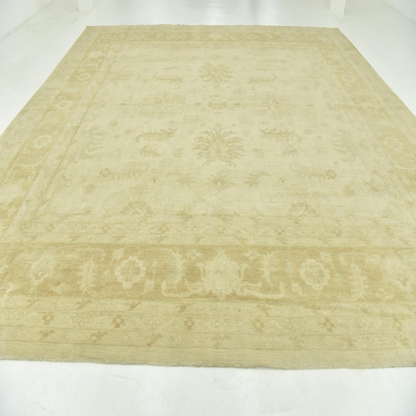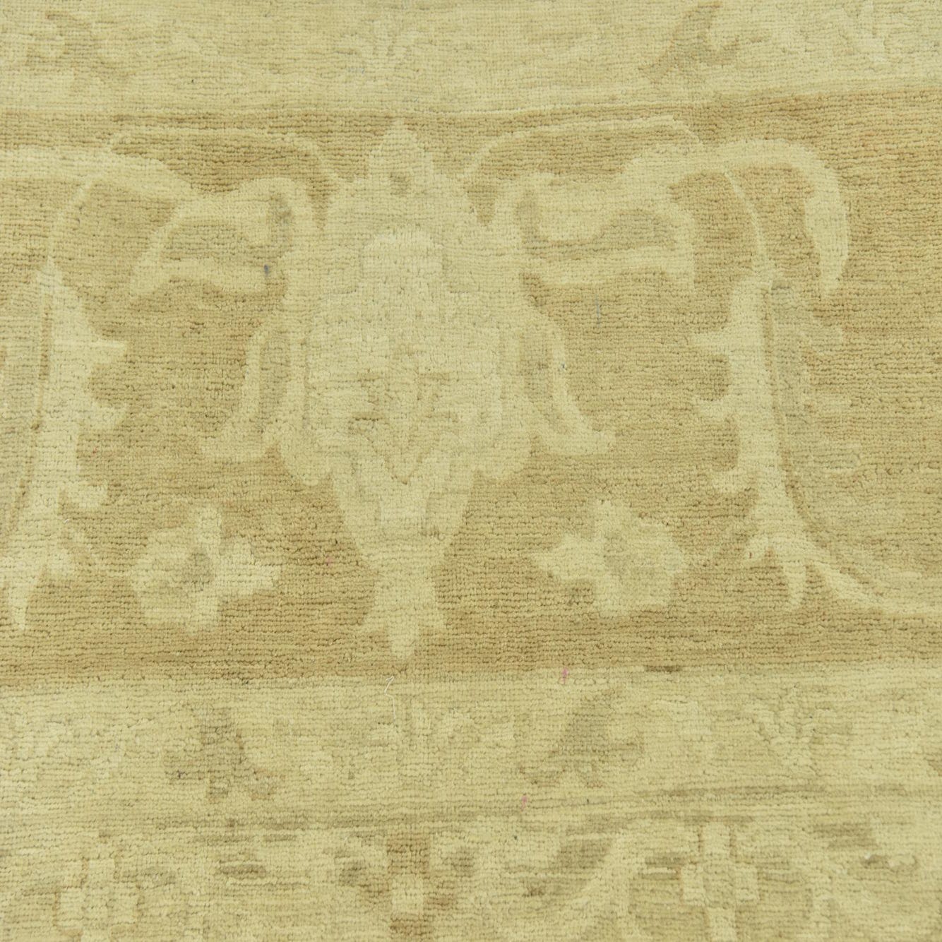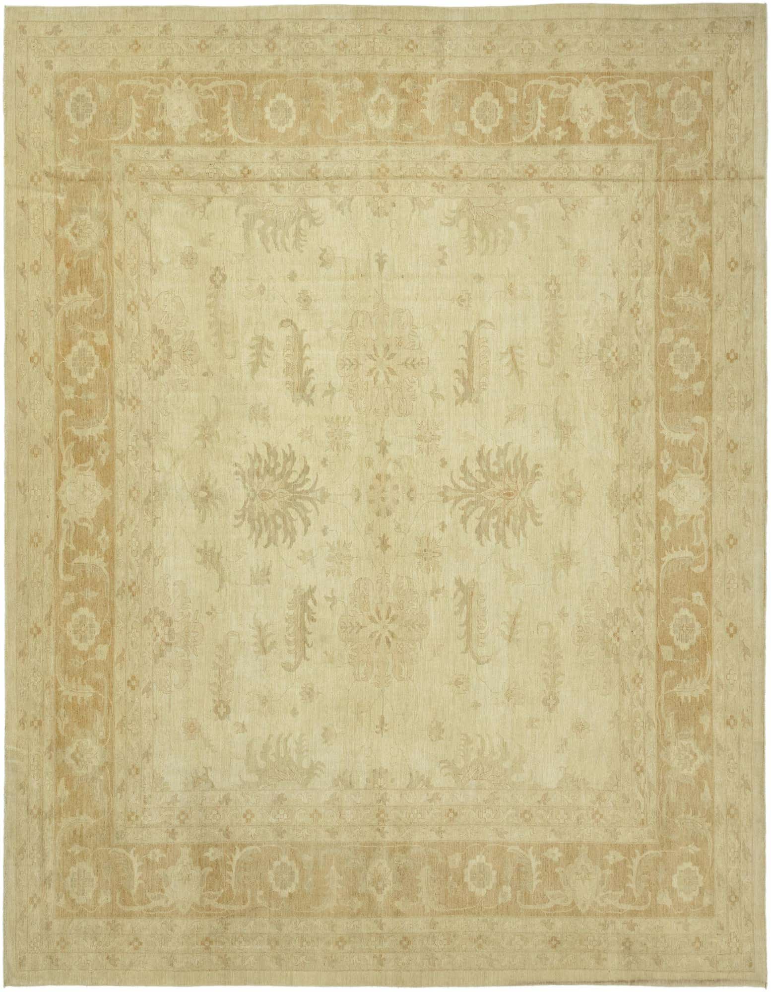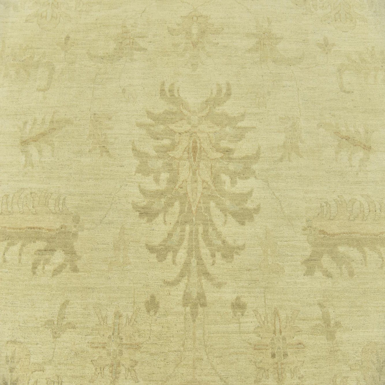 This Peshawar Ziegler rug is a hand-knotted piece, crafted with 100% hand-spun wool, offering a durable and texturally rich addition to any room. It measures a substantial 12 feet square, making it an ideal choice for anchoring larger spaces or defining seating areas within an open-plan setting. The rug features a predominantly beige background, complemented by accents in light brown, which together present a neutral yet warm color palette.