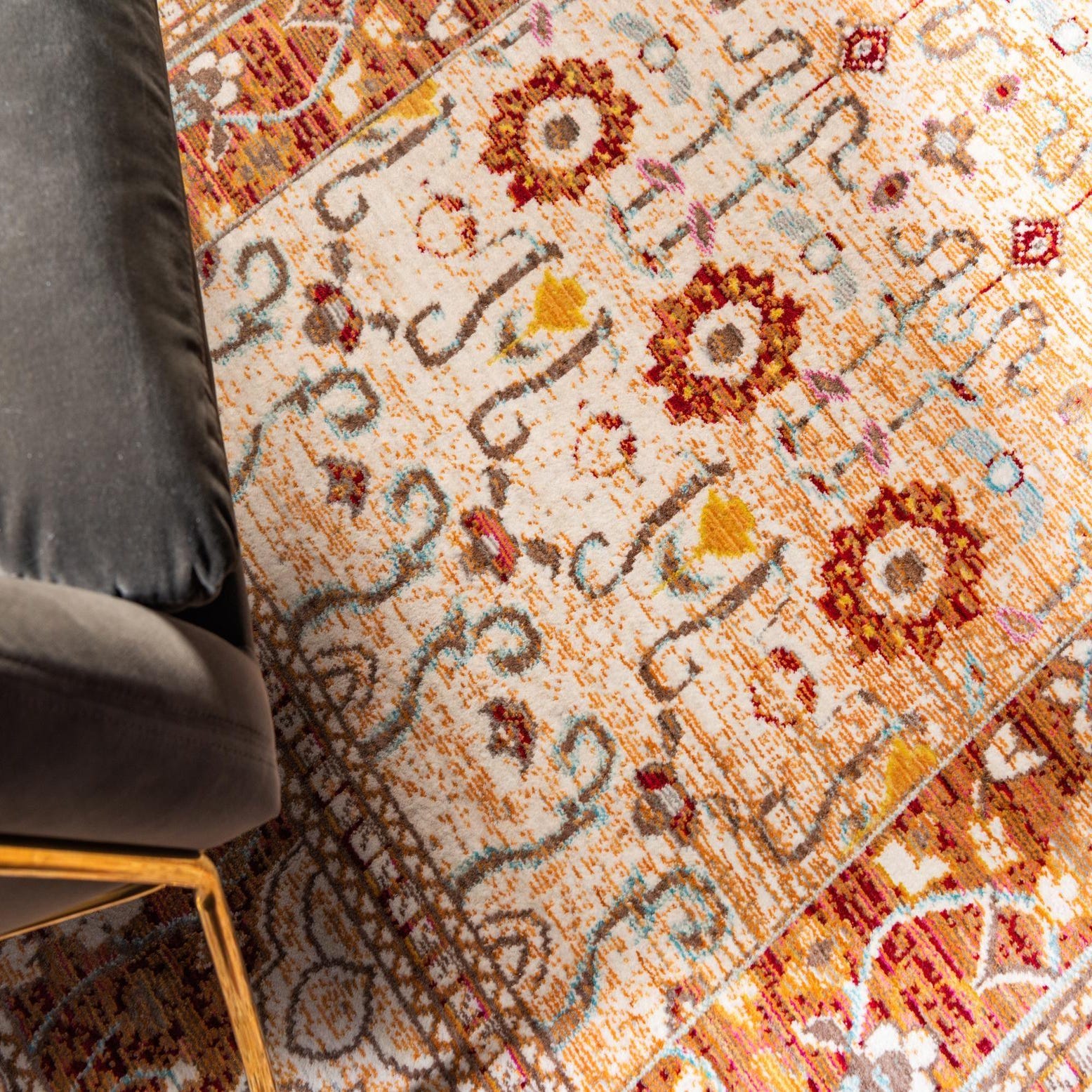 Primary color is Beige. Colors in this rug include: Beige, Blue, Brown, Burgundy, Cream, Puce, Gold.