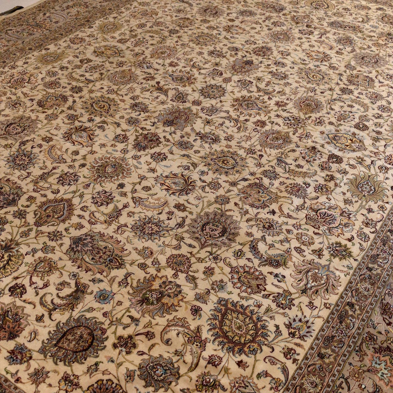The Tabriz collection offers a hand-made wool rug with a sophisticated beige background, accentuated by brown motifs. This 12x16 piece features a detailed traditional pattern with a rich display of floral and foliate designs, reminiscent of classic Persian craftsmanship. The intricate border frames the central field, creating a sense of depth and elegance. The texture of the wool contributes to the rug's overall sense of warmth and comfort.
