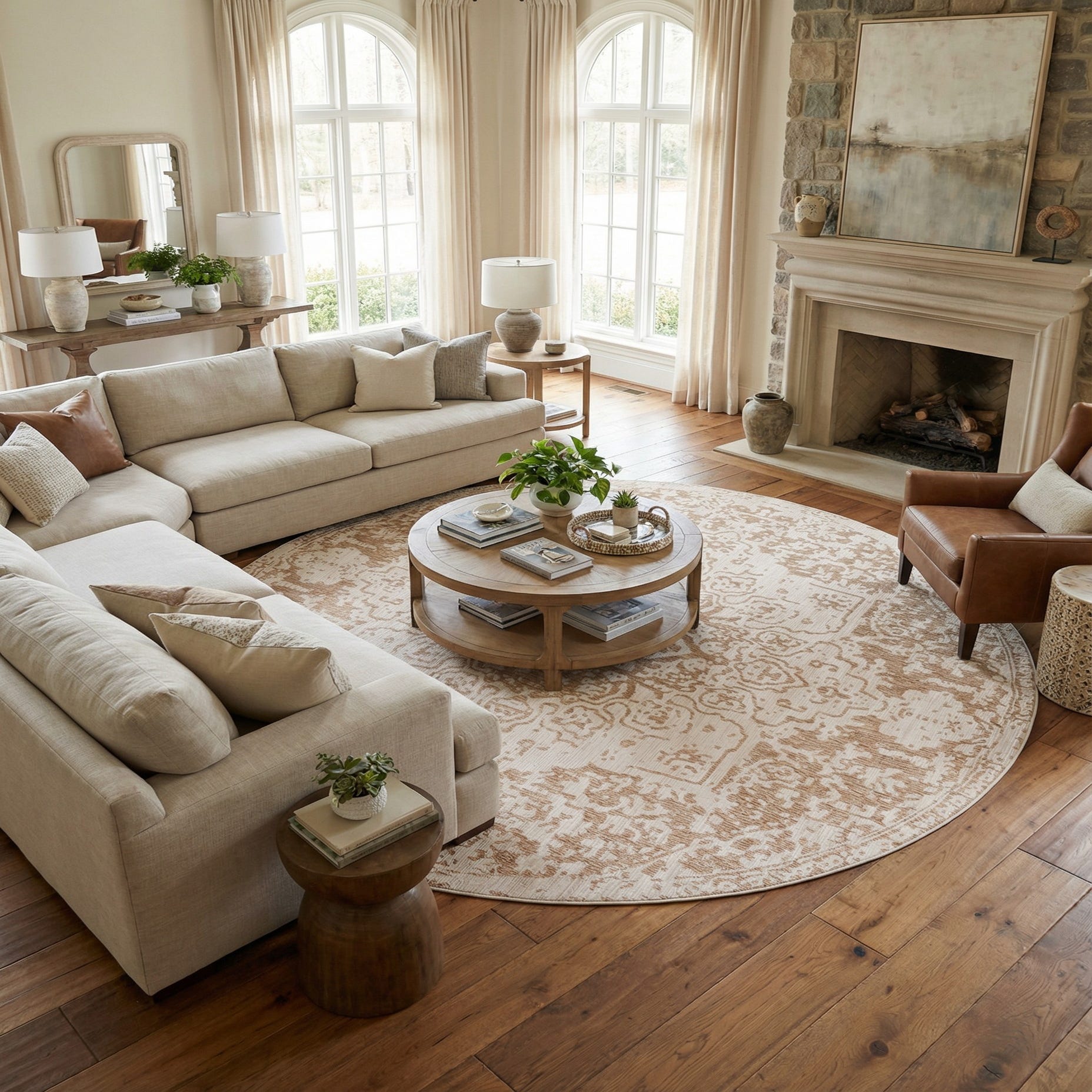 Ideal for covered patios, sunrooms, or a casual dining area, this rug pairs naturally with light wood furniture, wicker or rattan seating, and neutral linen upholstery. Its neutral beige-and-brown palette works with coastal, modern farmhouse, and transitional interiors — place it beneath a round dining table to anchor the space or layer it on a porch with potted greenery and comfortable seating for a relaxed, pulled-together look.