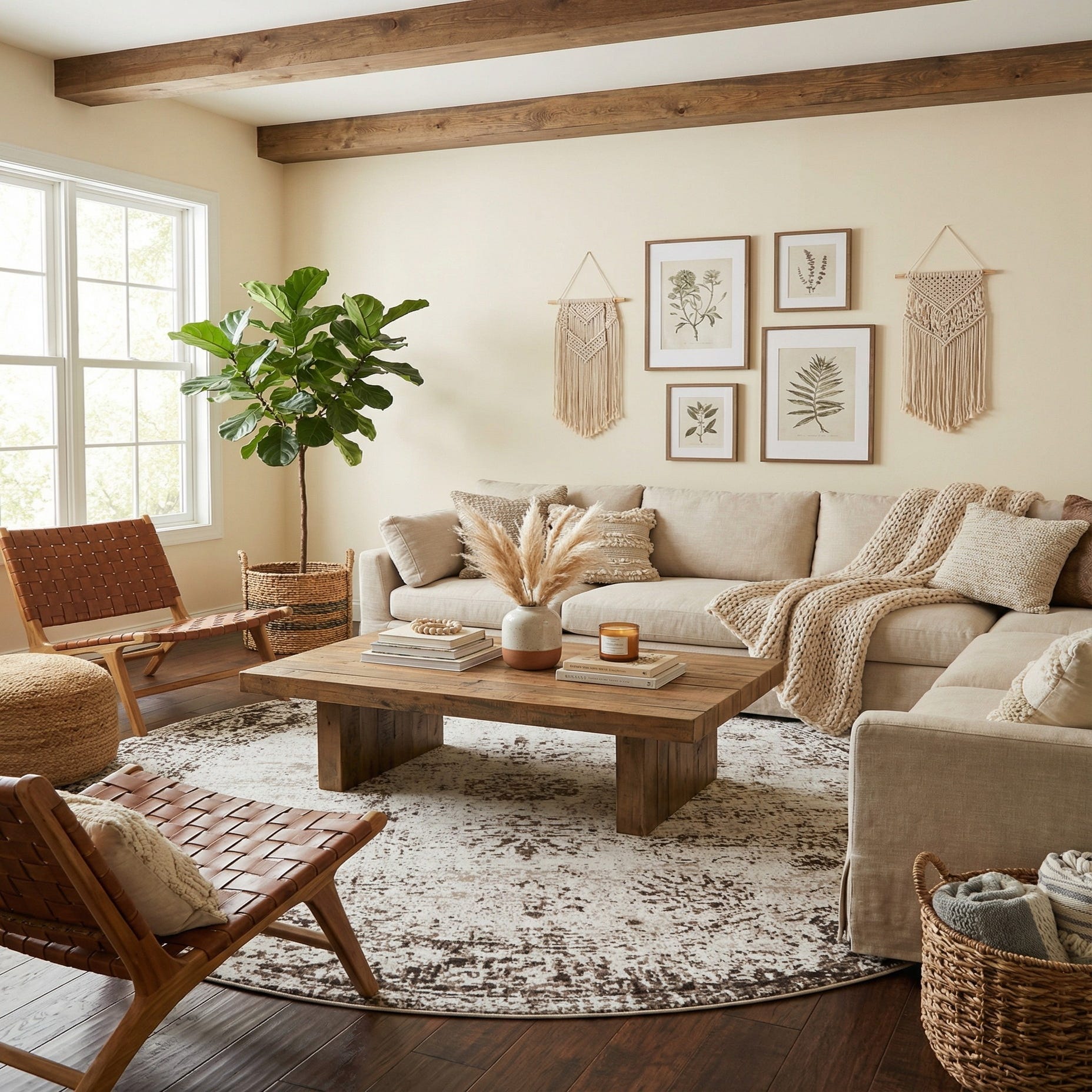 The neutral colorway and subtle pattern make this piece versatile in many interiors. It anchors a round dining table or defines a living room seating area without competing with other textures. It pairs naturally with warm woods, leather seating, linen upholstery and mixed-metal accents, and works well in transitional, modern farmhouse, or contemporary spaces that benefit from a soft, grounded layer.