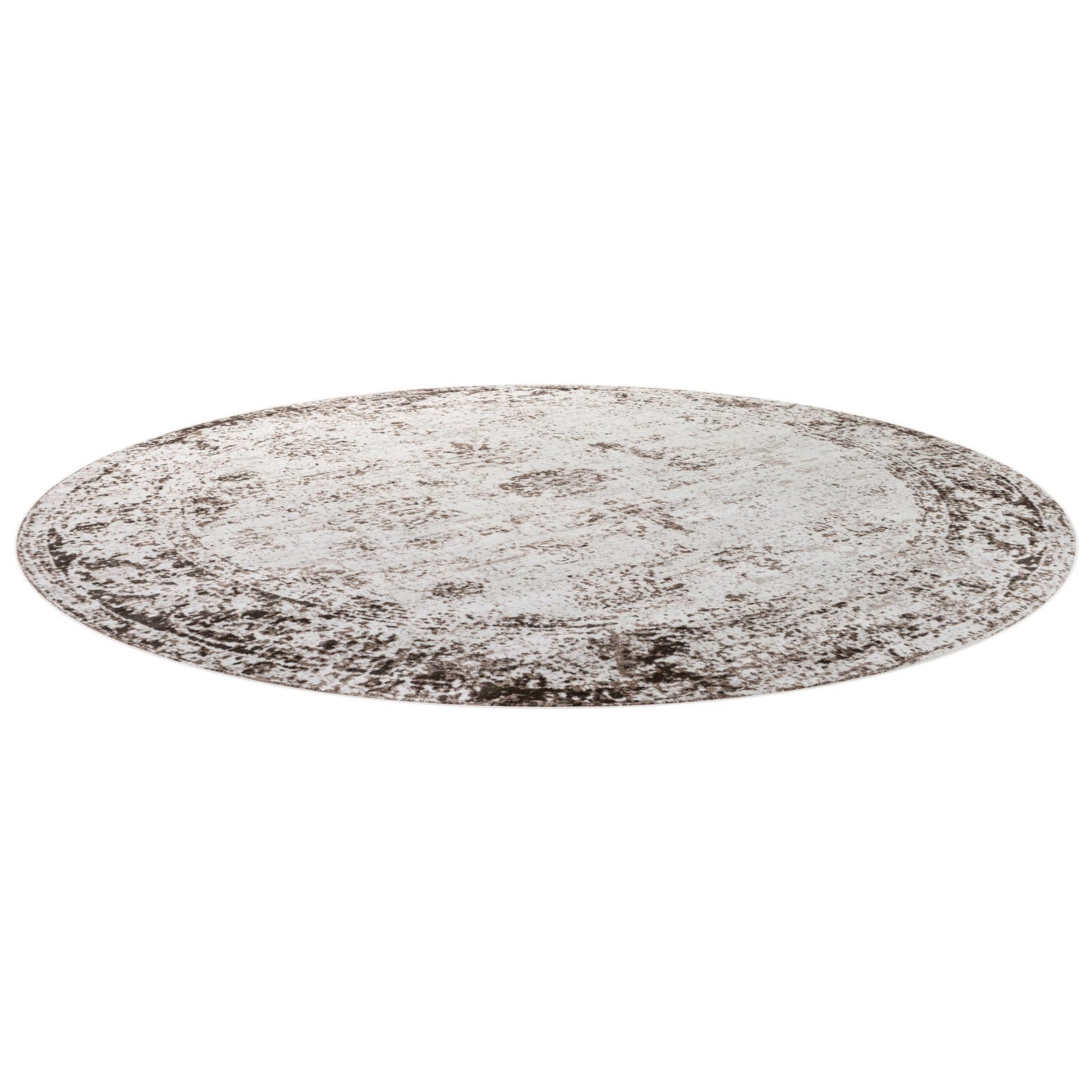 This round rug is machine made from 100% polypropylene and rests low to the floor with a smooth, even pile that feels soft underfoot. A beige background sets a calm foundation while brown and tan pigments form a gently distressed medallion and outer border. The pattern is intentionally worn and irregular, giving the surface a lived-in, vintage-inspired look where darker accents catch the light against the warm beige field.