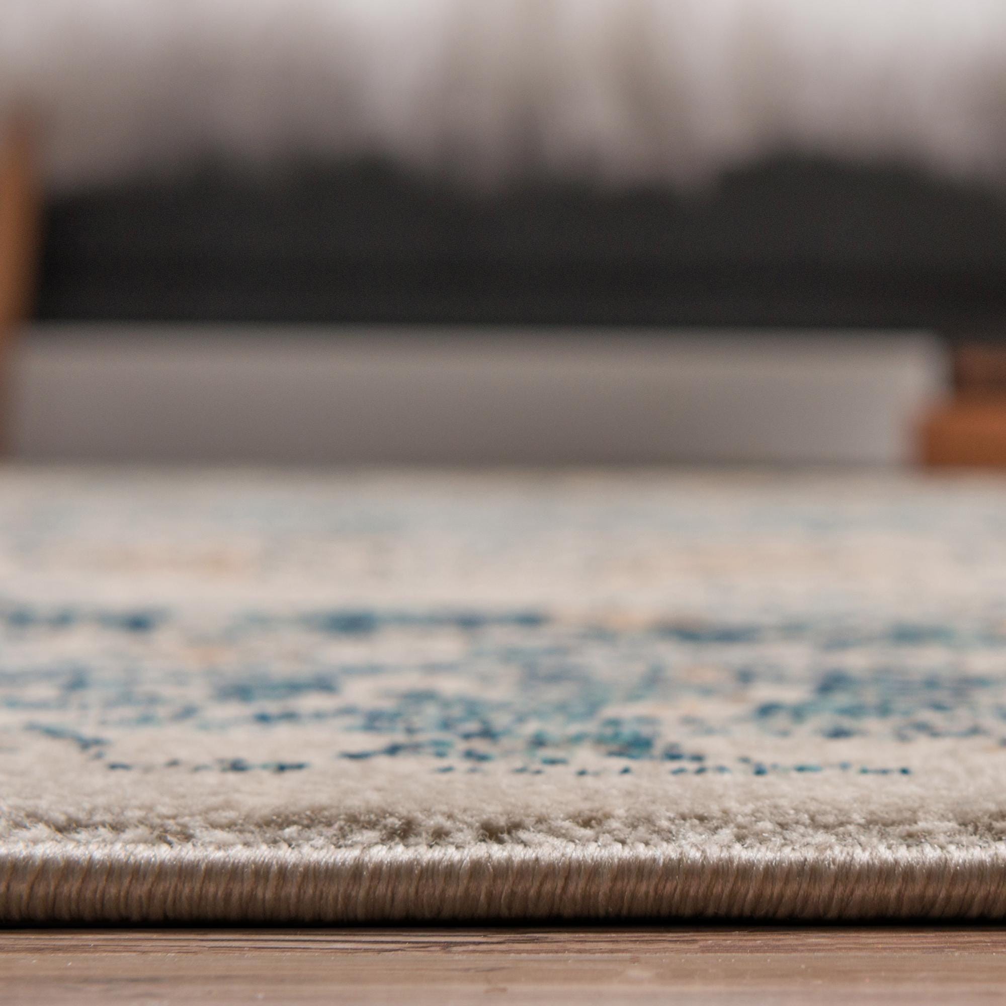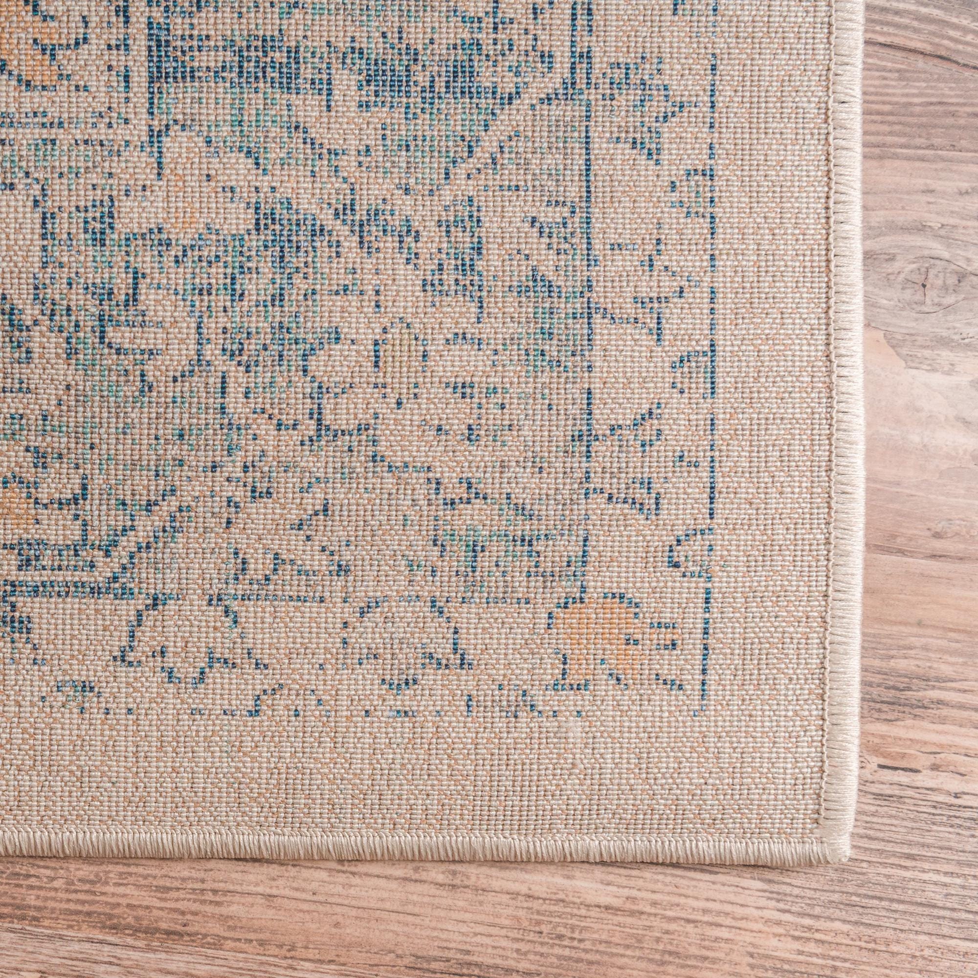 Primary color is Beige. Colors in this rug include: Beige, Blue, Navy Blue, Tan.