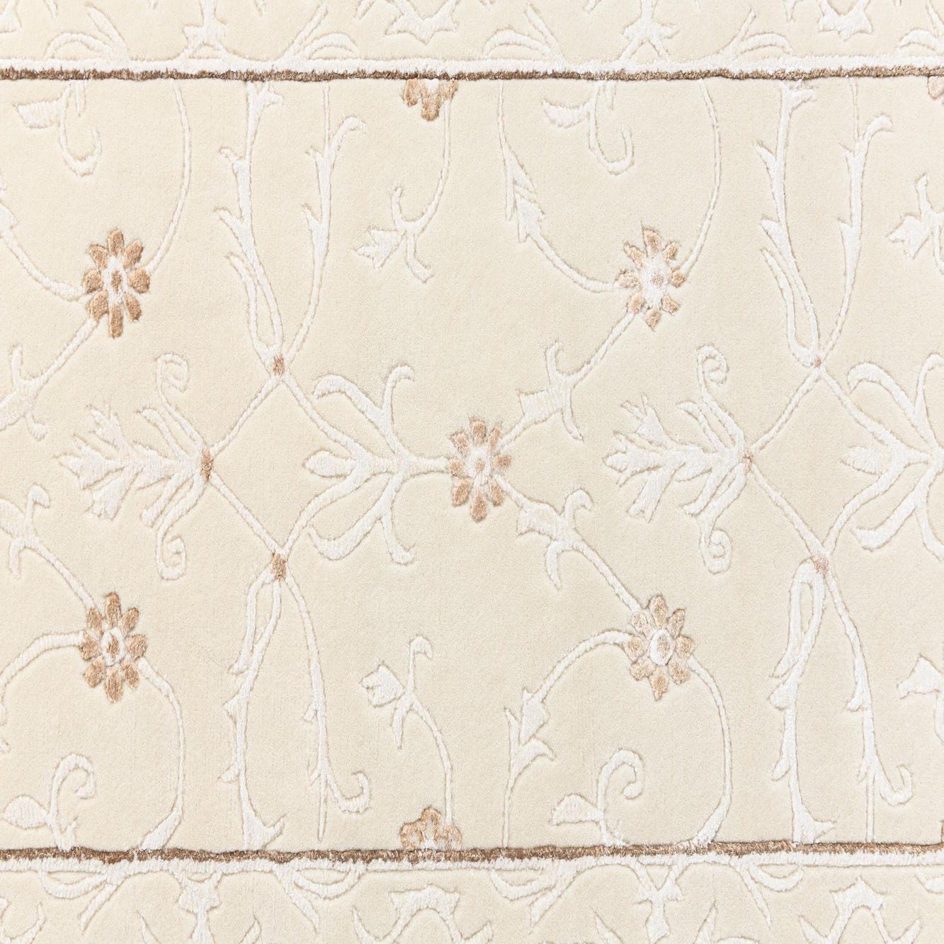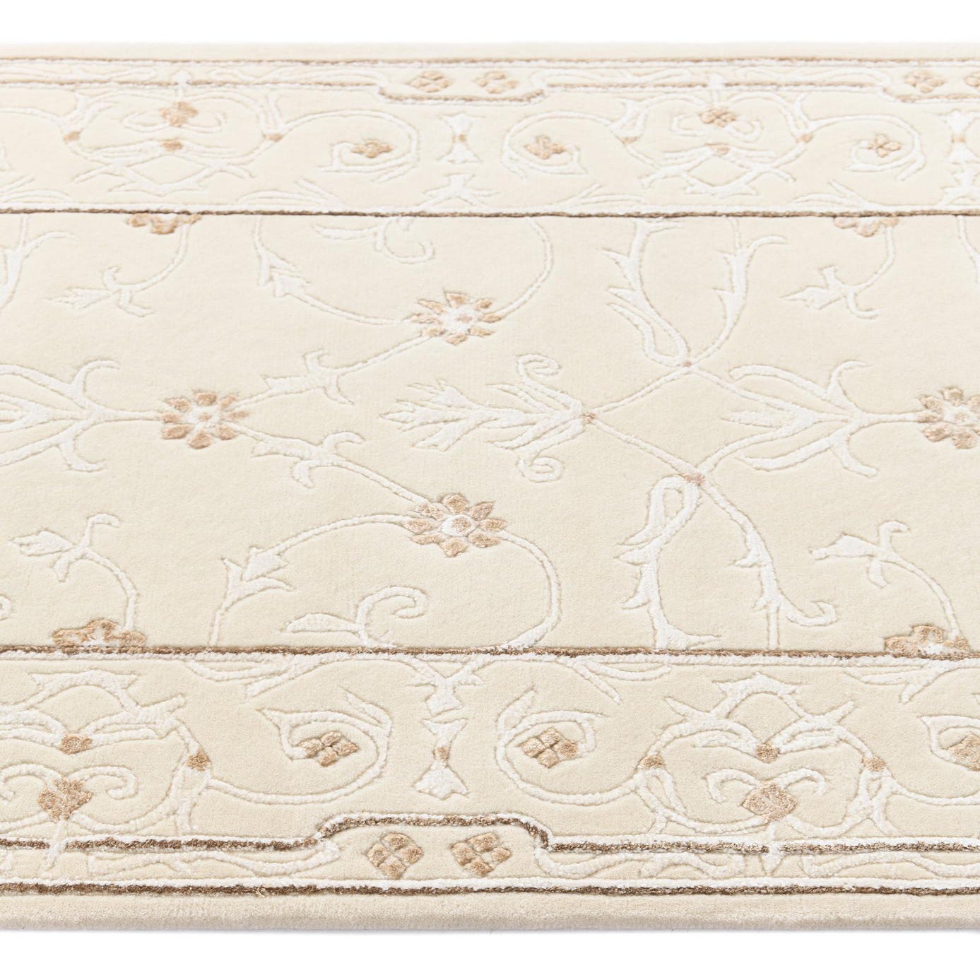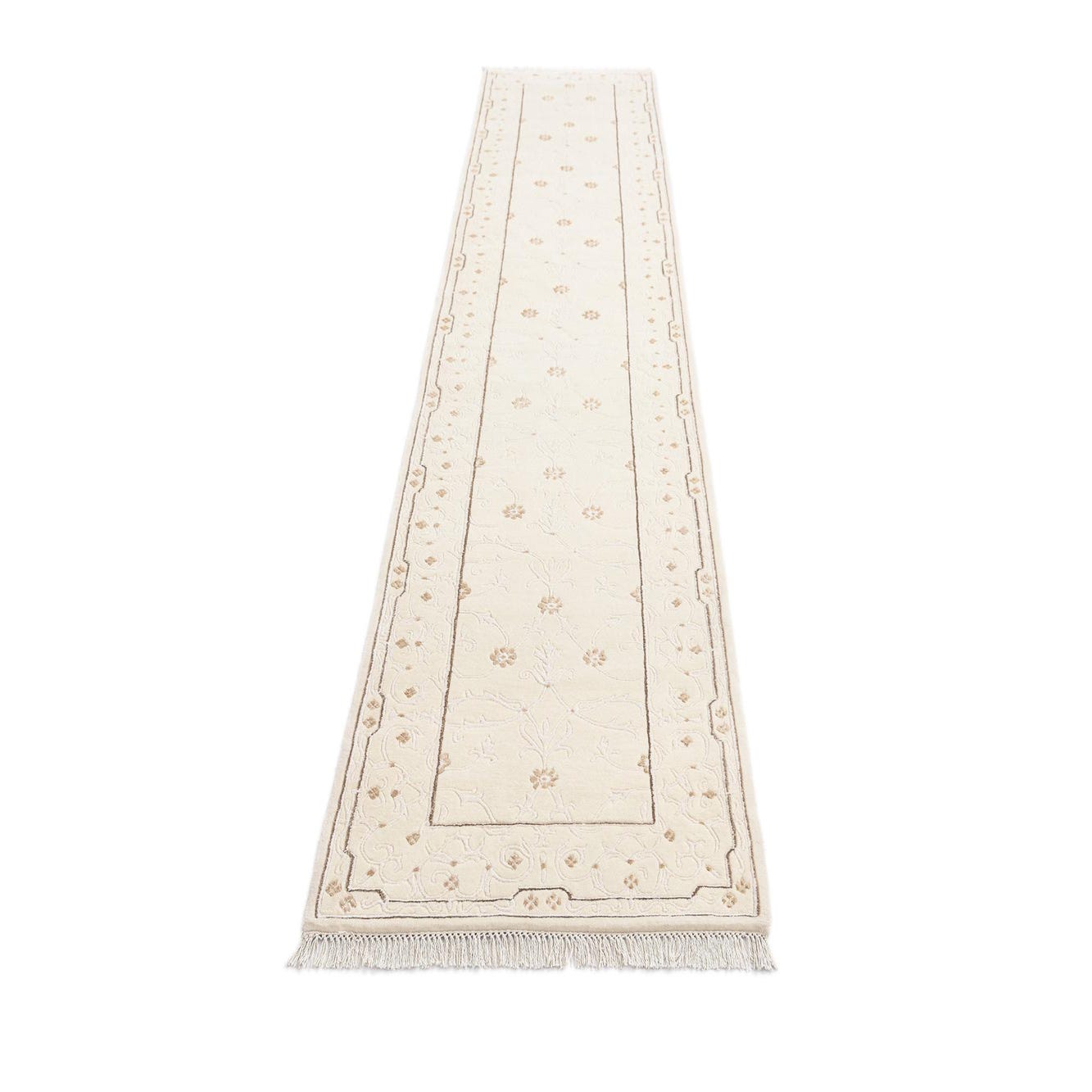 A 13 ft Darya runner rug in ivory and tan, featuring a modern Persian floral pattern with a high pile, perfect for a hallway.