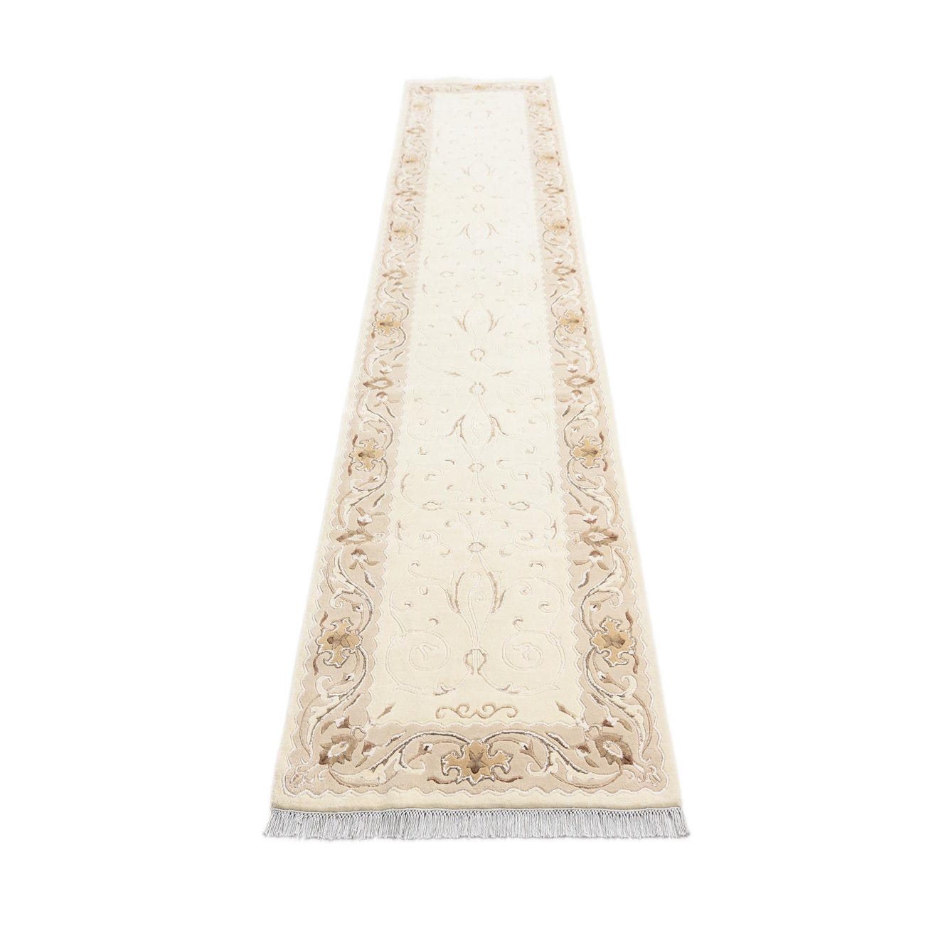 A 13 ft Darya runner rug in ivory and tan with a Persian-inspired floral and vine pattern, perfect for a hallway.