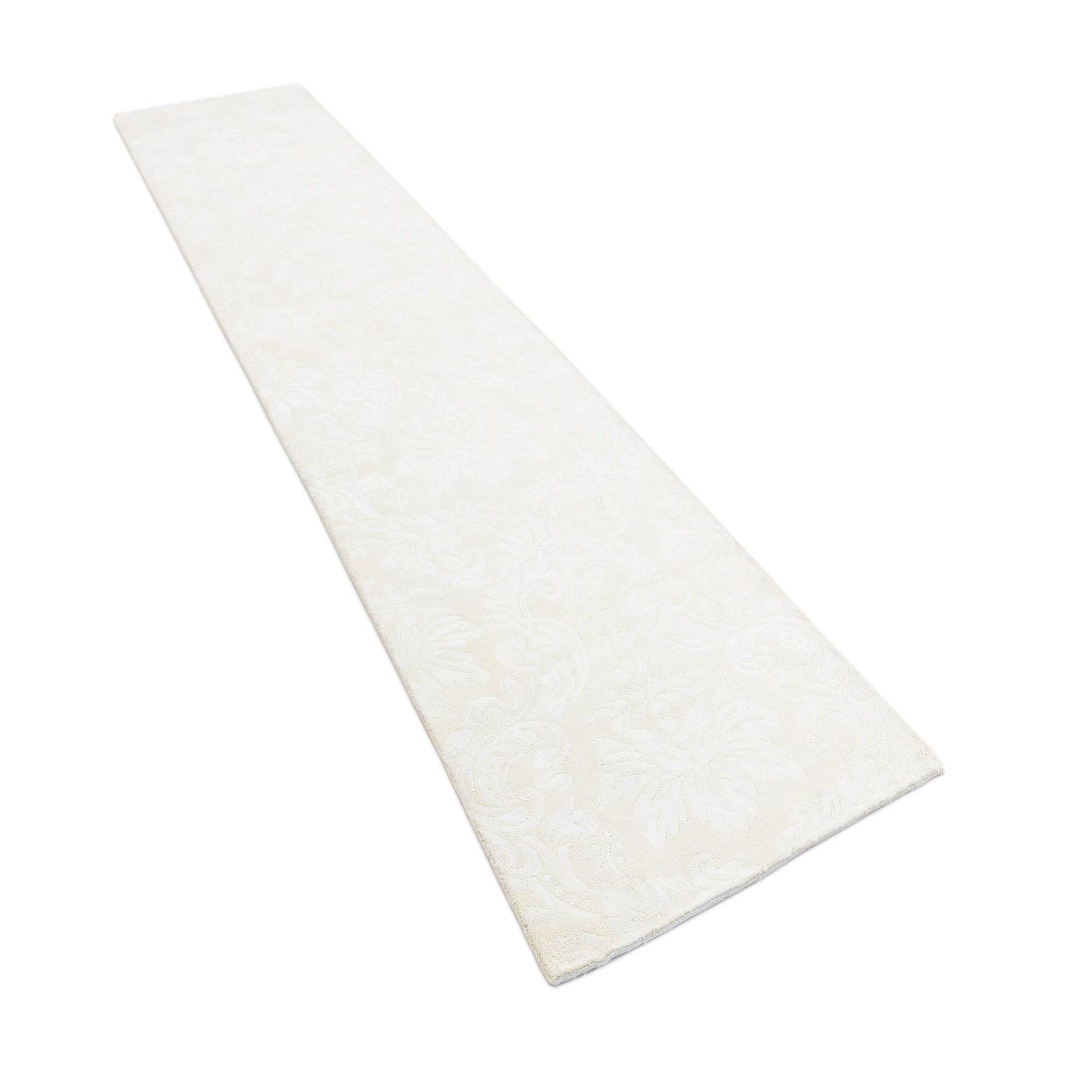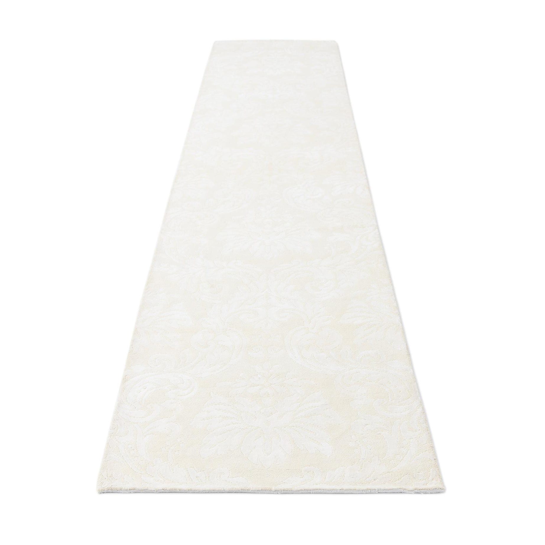 A 13 ft Darya runner rug in shades of ivory and cream, featuring a subtle modern Persian pattern, ideal for a hallway.