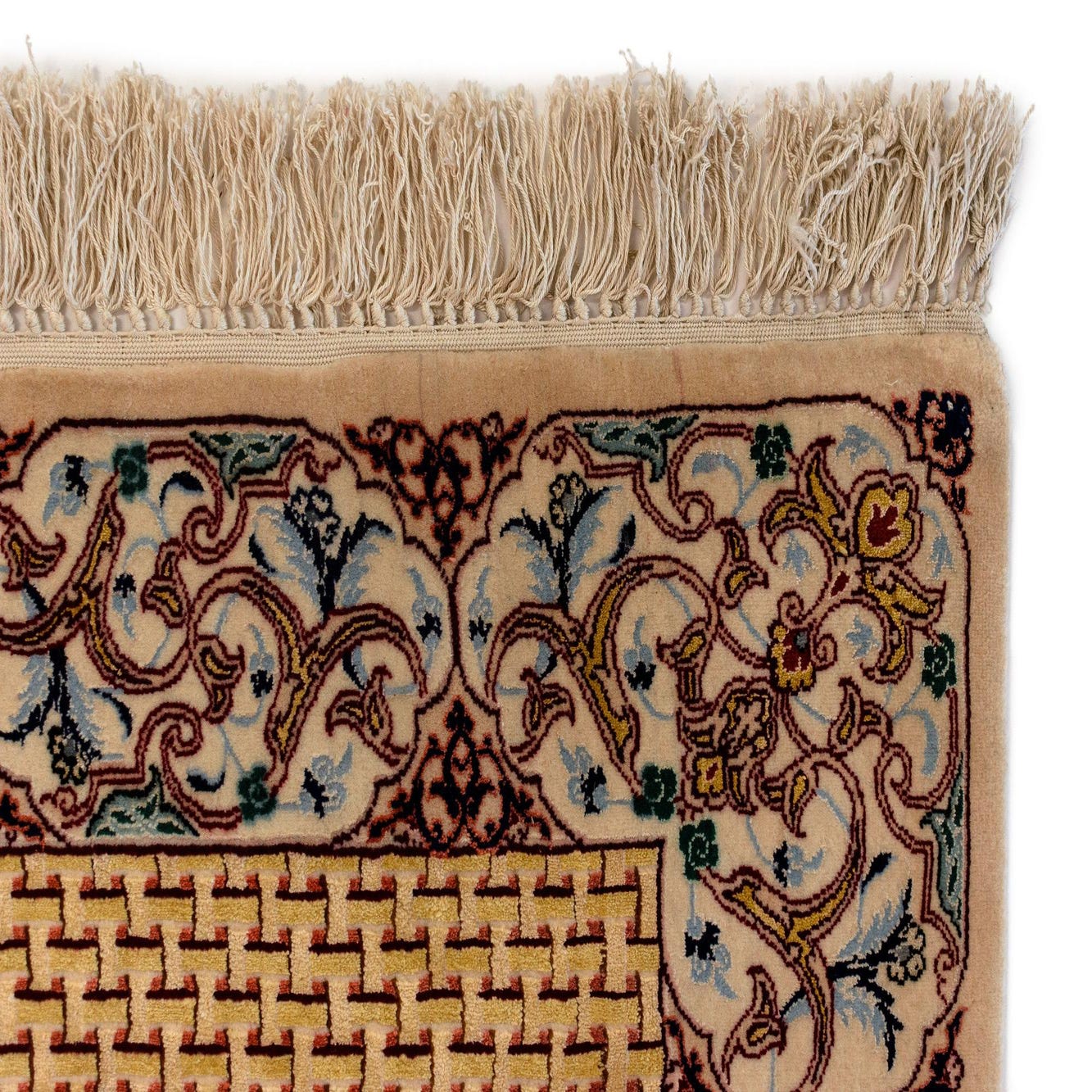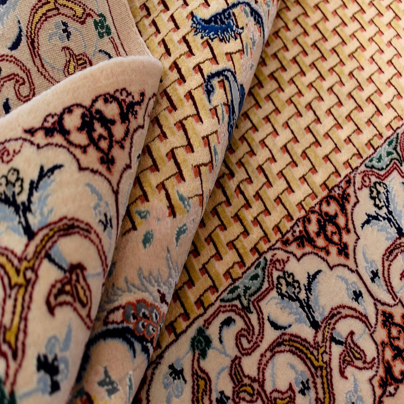 The Isfahan collection presents a 13-foot hand-made wool runner rug characterized by a comforting beige background. Ornamented with intricately designed medallion motifs, each features a diverse palette that complements its neutral base. The runner showcases a detailed border with a harmonious mix of scrollwork and botanical elements, which adds visual interest and depth to the overall design.