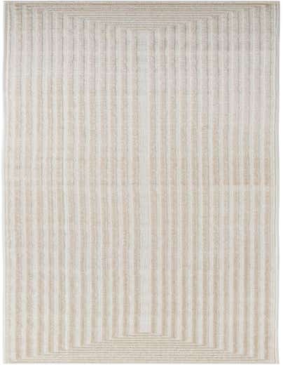 Part of the Sabrina Soto Outdoor collection, this machine-woven rug showcases a symmetrical geometric pattern defined by repeating rectangles that create a sense of depth and motion. The design displays a tasteful blend of beige and cream hues, providing a neutral color palette that can complement a variety of outdoor settings.
