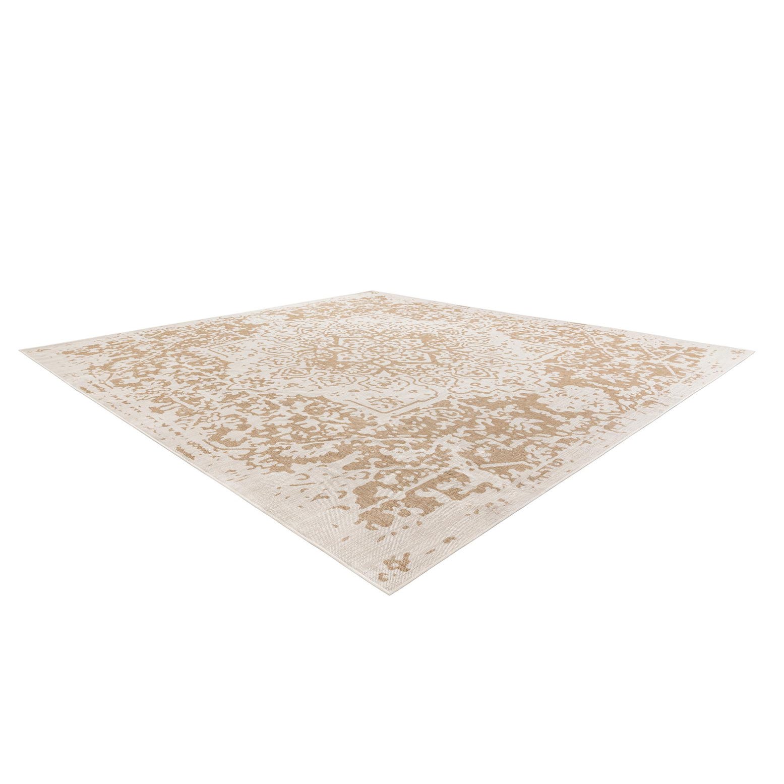 Adorned with an intricate pattern, the design showcases a harmonious blend of beige and brown hues, set against a beige background that exudes a natural warmth and sophistication. The ornate detailing is balanced with the rug's overall subtle color palette, making it an adaptable addition to a variety of outdoor spaces.