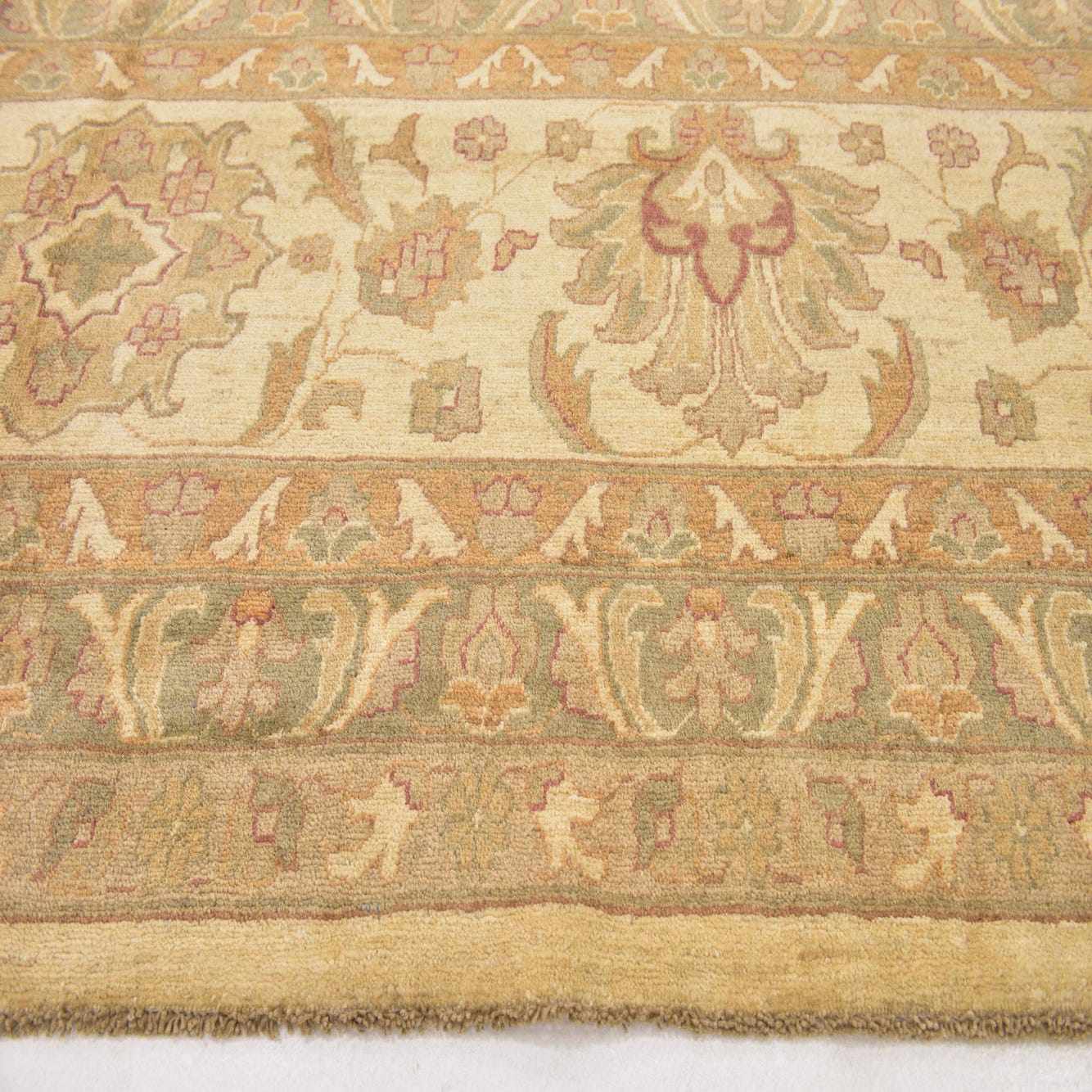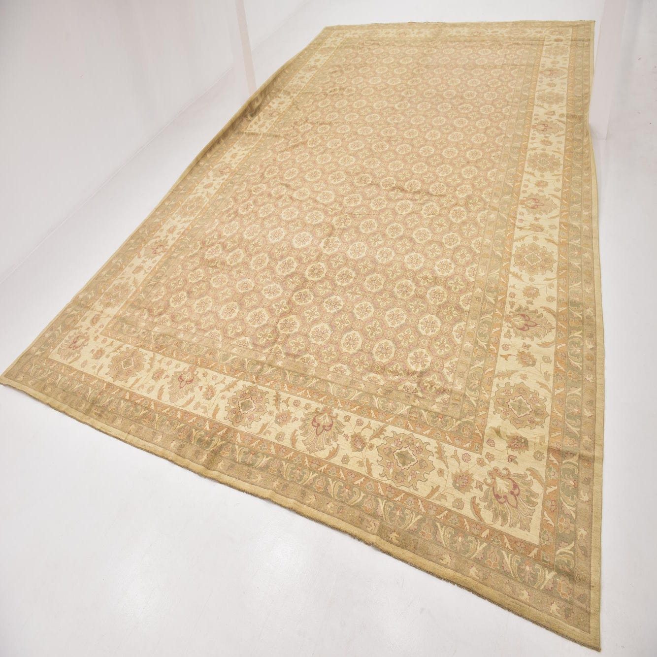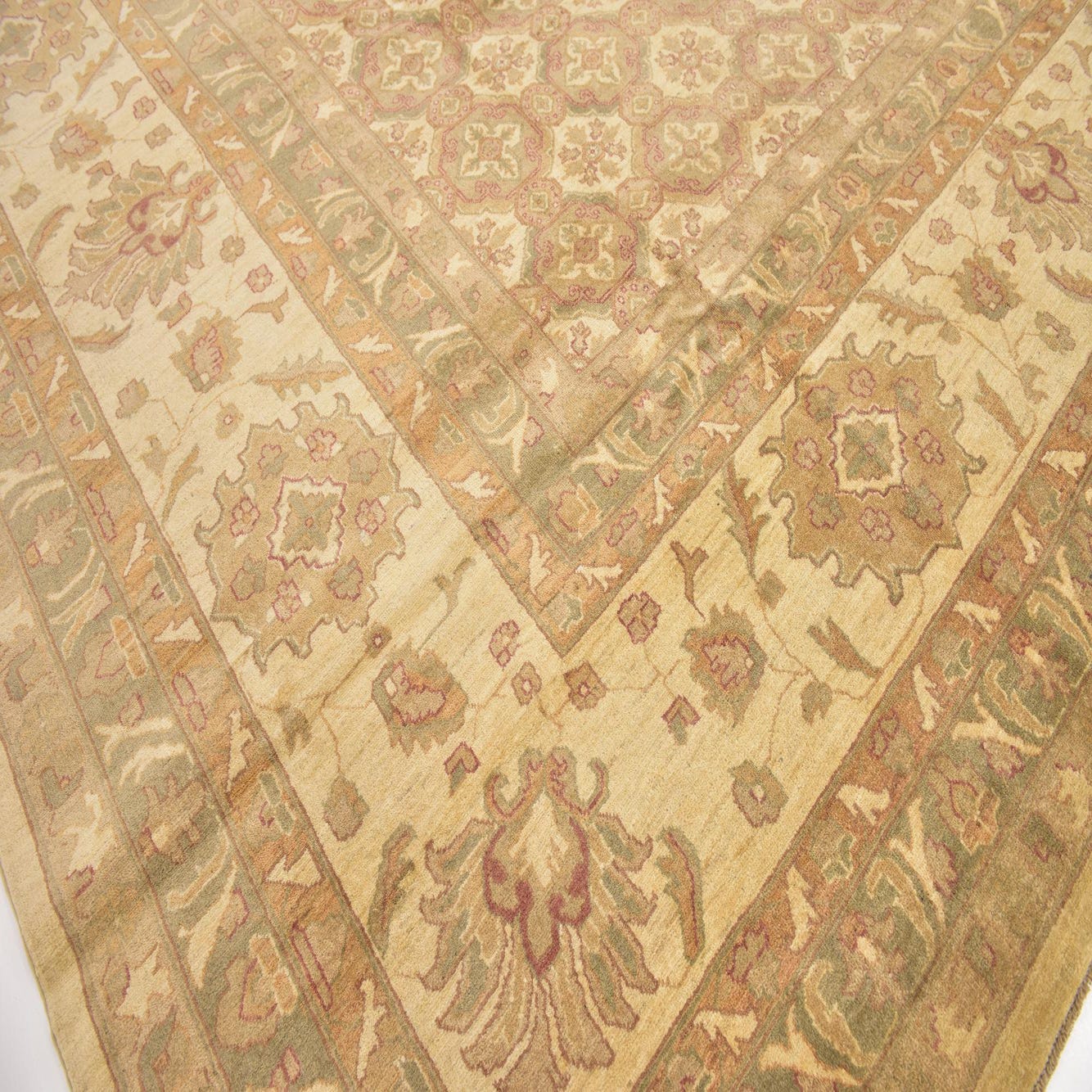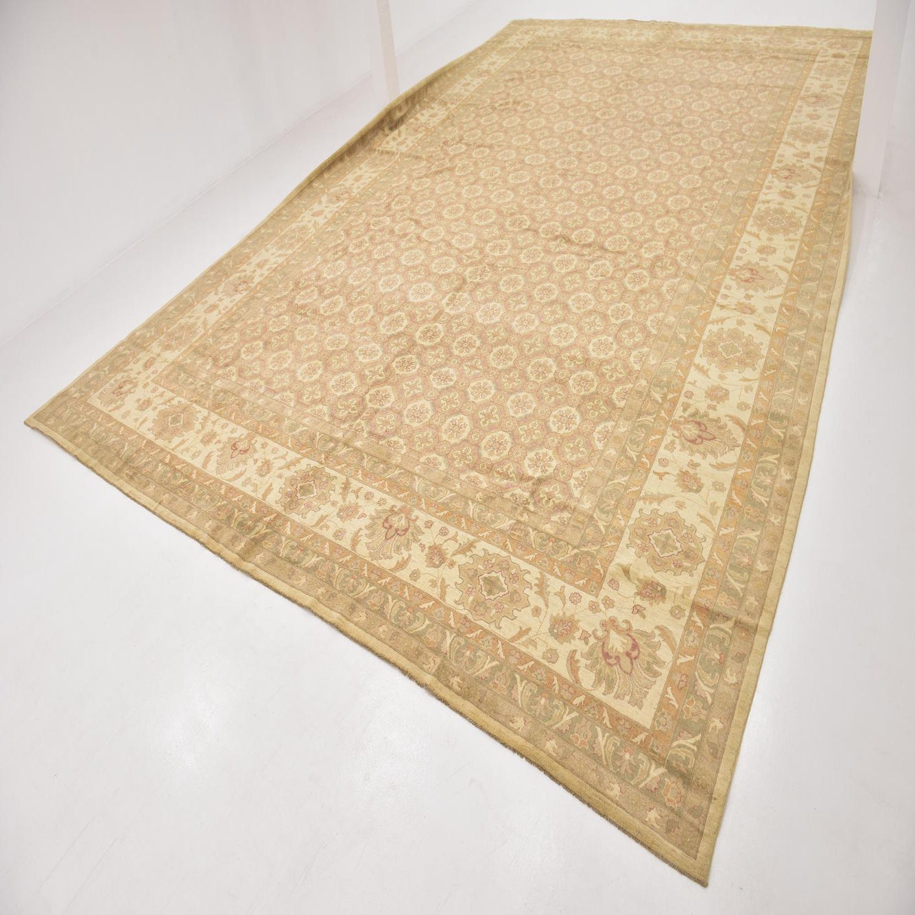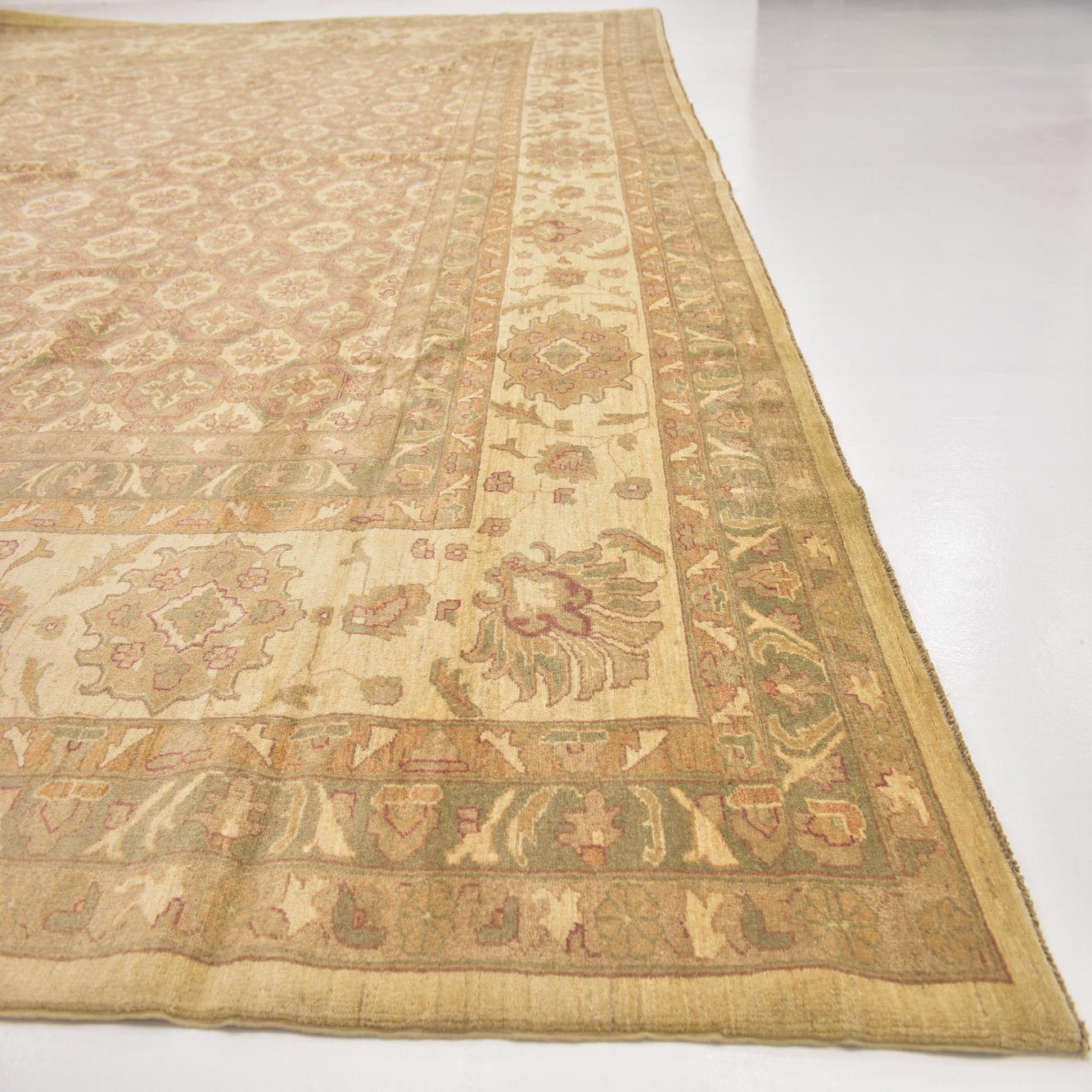A large 13x18 rectangular Peshawar Ziegler rug with a traditional botanical pattern in browns, tans, and ivories.