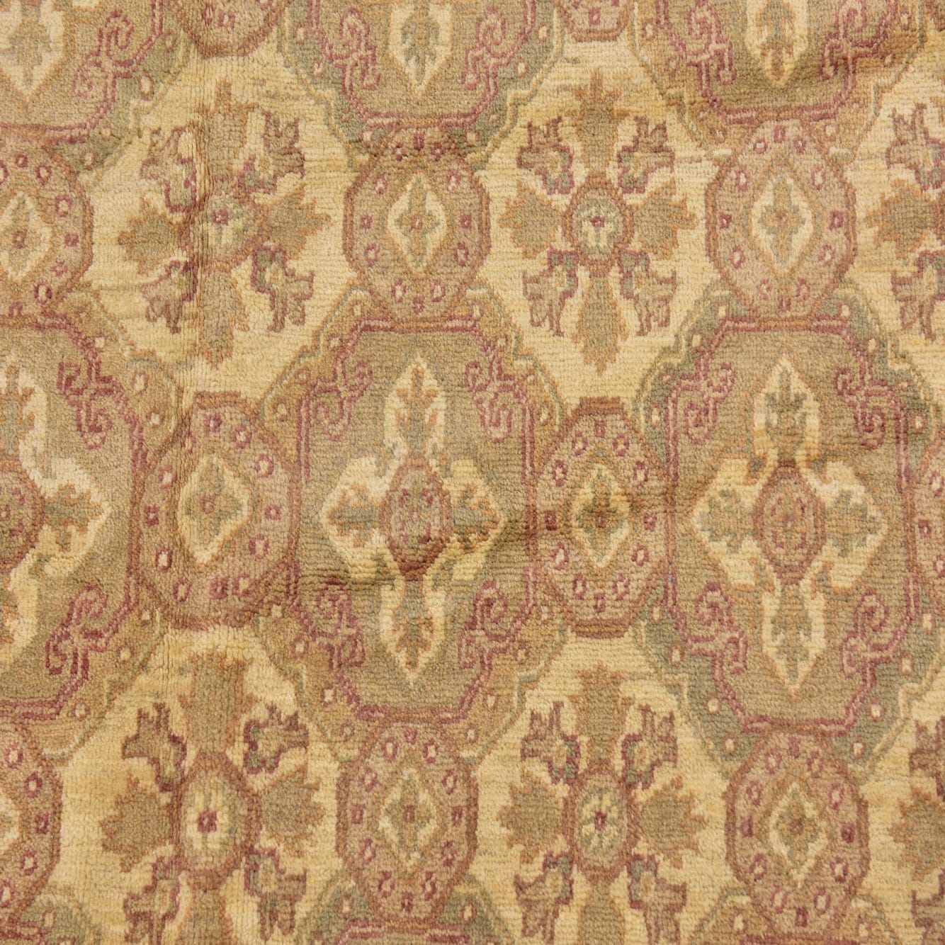 Primary color is Beige. Colors in this rug include: Beige, Cream, Gold, Peach, Rust Red, Brown, Olive.