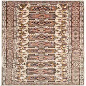 Primary color is Beige. Colors in this rug include: Beige, Cream, Brown, Red, Blue.