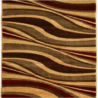 Flowing, wave-like bands travel the length of this runner, creating an organic, rhythmic pattern against a warm beige ground. Layers of burgundy, brown, gray and olive arc and overlap with accents of black and blue, producing rich tonal movement and subtle striations that read as depth rather than high contrast. Machine-made from 100% polypropylene, the rug has a low-to-medium pile with a smooth, slightly cushioned surface; the cut-pile finish and color variations give it a soft hand and gentle texture underfoot.