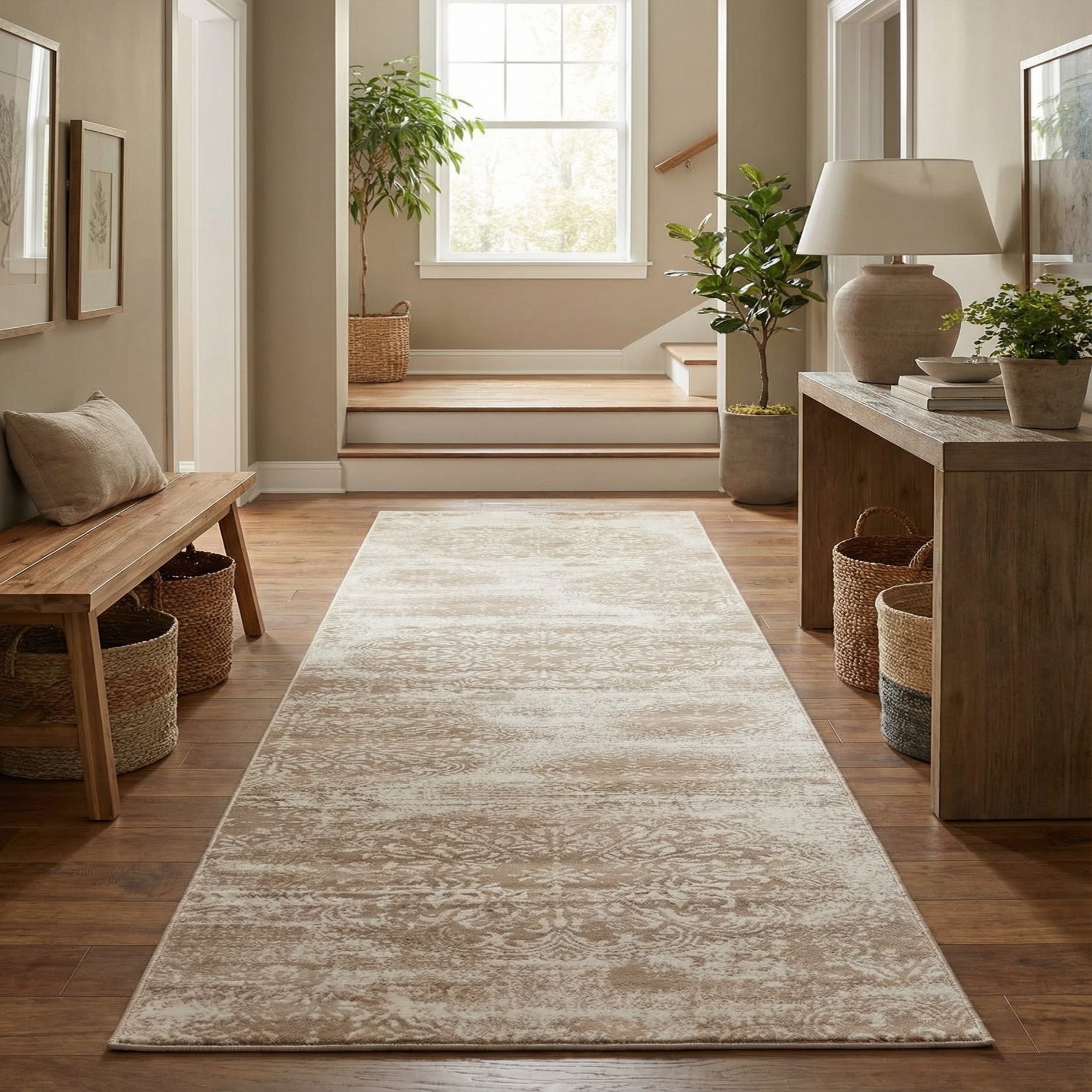 Machine-made of 100% polypropylene, the runner has a low, dense pile with a slightly velvety hand and a subtle sheen under light. Sized to define narrow spaces, it works well in hallways and entryways or alongside a bed or kitchen corridor to add layered texture. The beige-and-ivory palette coordinates easily with warm woods, soft-painted millwork, light upholstery, and décor schemes from traditional and transitional to modern farmhouse and coastal-inspired interiors.