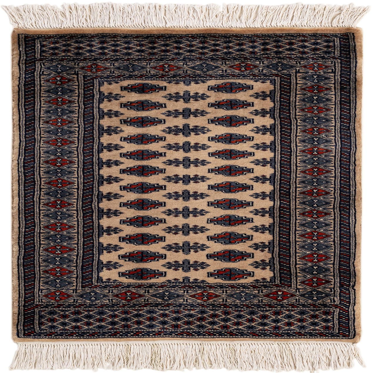 A 2x3 rectangular Bokhara rug with a tan field, featuring traditional tribal patterns in red and navy, and white fringe.