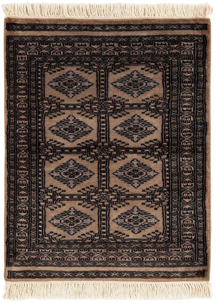 A 2x3 rectangular Bokhara rug with a tan field, black and blue tribal patterns, and ivory fringe.