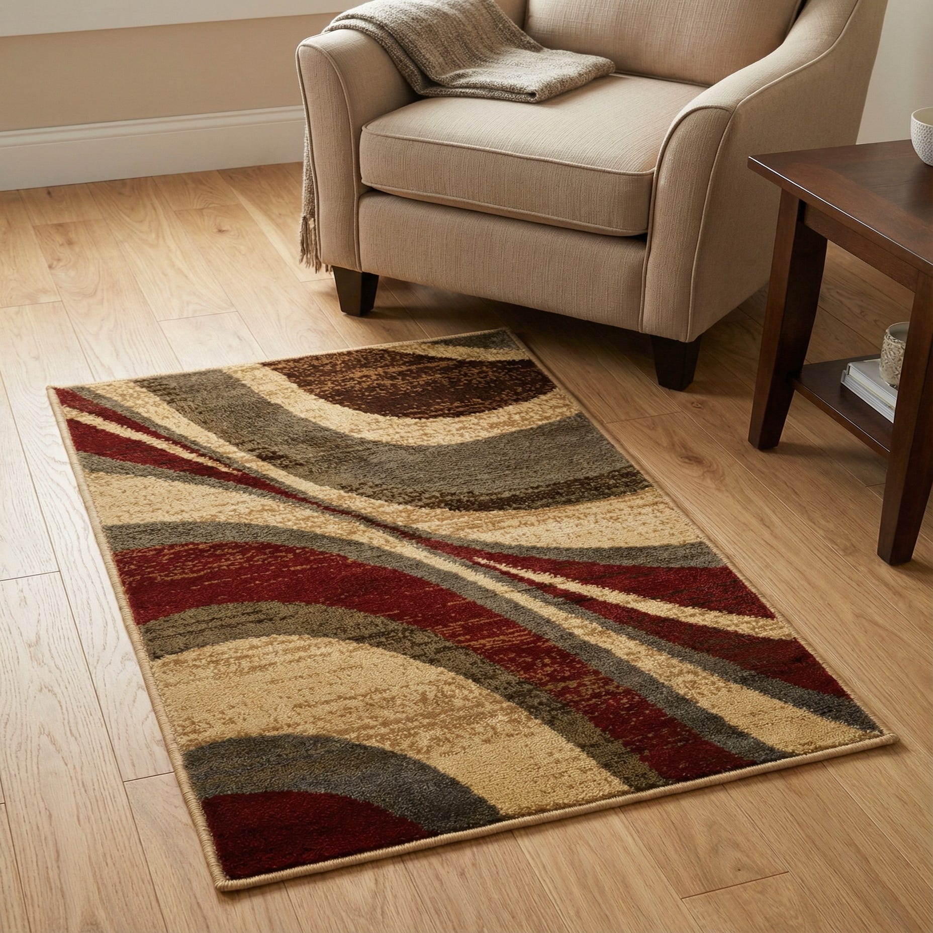 An abstract, contemporary pattern of sweeping arcs and tapered bands gives this rug dynamic movement while a beige background keeps the composition grounded. Rich burgundy and deep brown form bold, curved fields that contrast with layered gray and olive accents, while touches of black and blue add depth across the design. The machine-made construction in 100% polypropylene produces a soft, slightly lustrous pile that feels cushioned underfoot and holds its shape for everyday use.