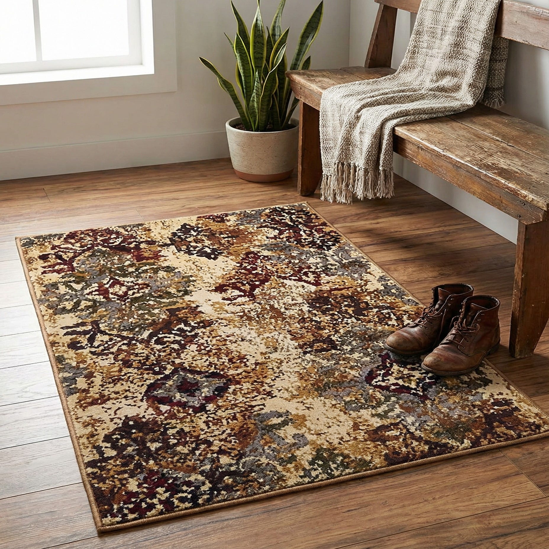 Machine-made from 100% polypropylene, the rug has a low-profile, dense pile with a soft, slightly lustrous hand that feels pleasant underfoot. Its construction makes it a practical accent for compact spaces: place it at an entryway, by a bedside, in front of a sofa, or beneath a small dining set. It pairs naturally with warm wood flooring, leather or upholstered seating, and mixed-metal accents, and fits well in transitional, bohemian, or eclectic interiors that benefit from a touch of layered, lived-in character.